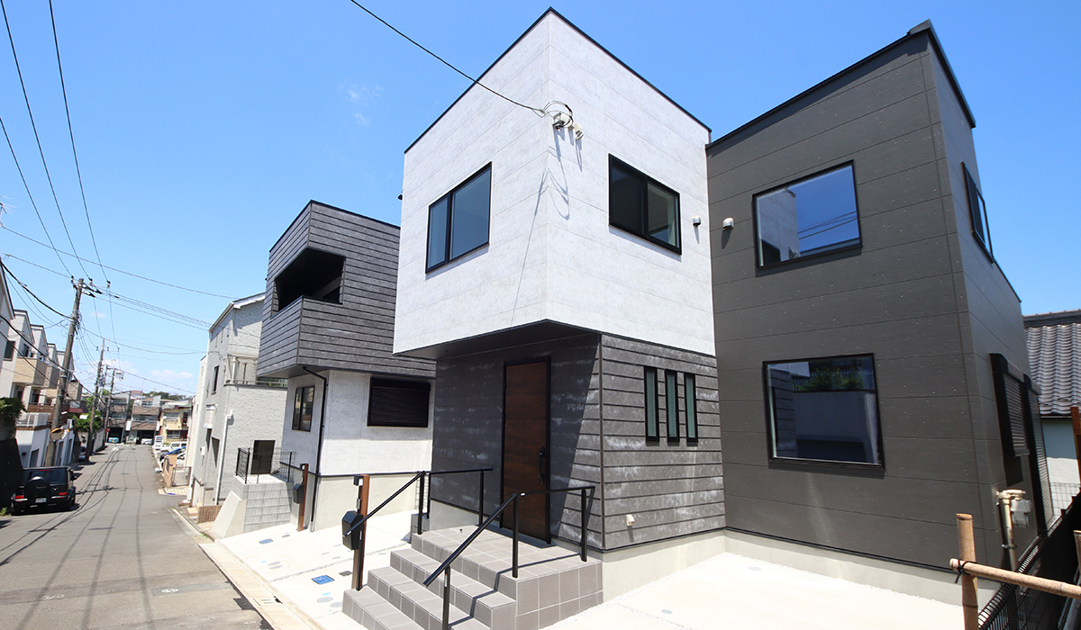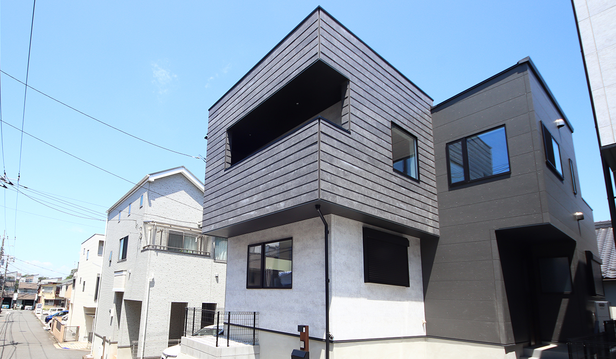 凹凸ある立体構成が描く陰影と異素材の融合が織りなす外観は、シンプルでありながら洗練された印象を放ちます。直線美を際立たせた都会的なファサードは、周囲の街並みに調和しつつも強い存在感を示し、暮らしを彩るデザイン性豊かな邸宅として高い完成度を誇ります。