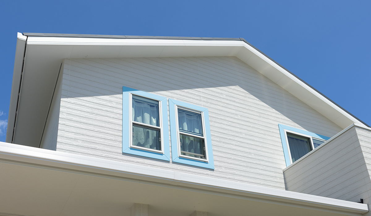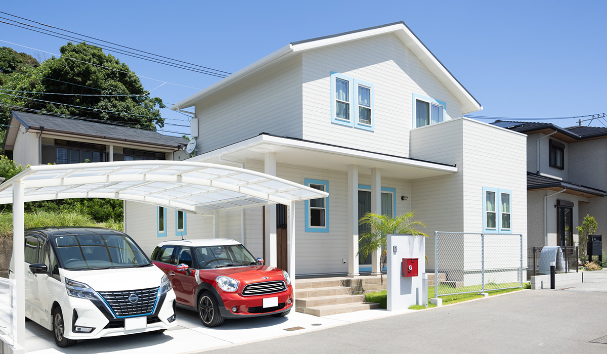 白い木目と窓まわりのティファニーブルーのモールが映えるカリフォルニアスタイルの外観に仕上げました。 セフィロウッドの美しい白も青空に映えます。 カバードポーチを設けることでカリフォルニアスタイル的な雰囲気を高めました。
