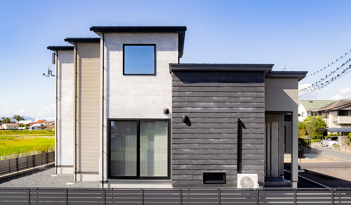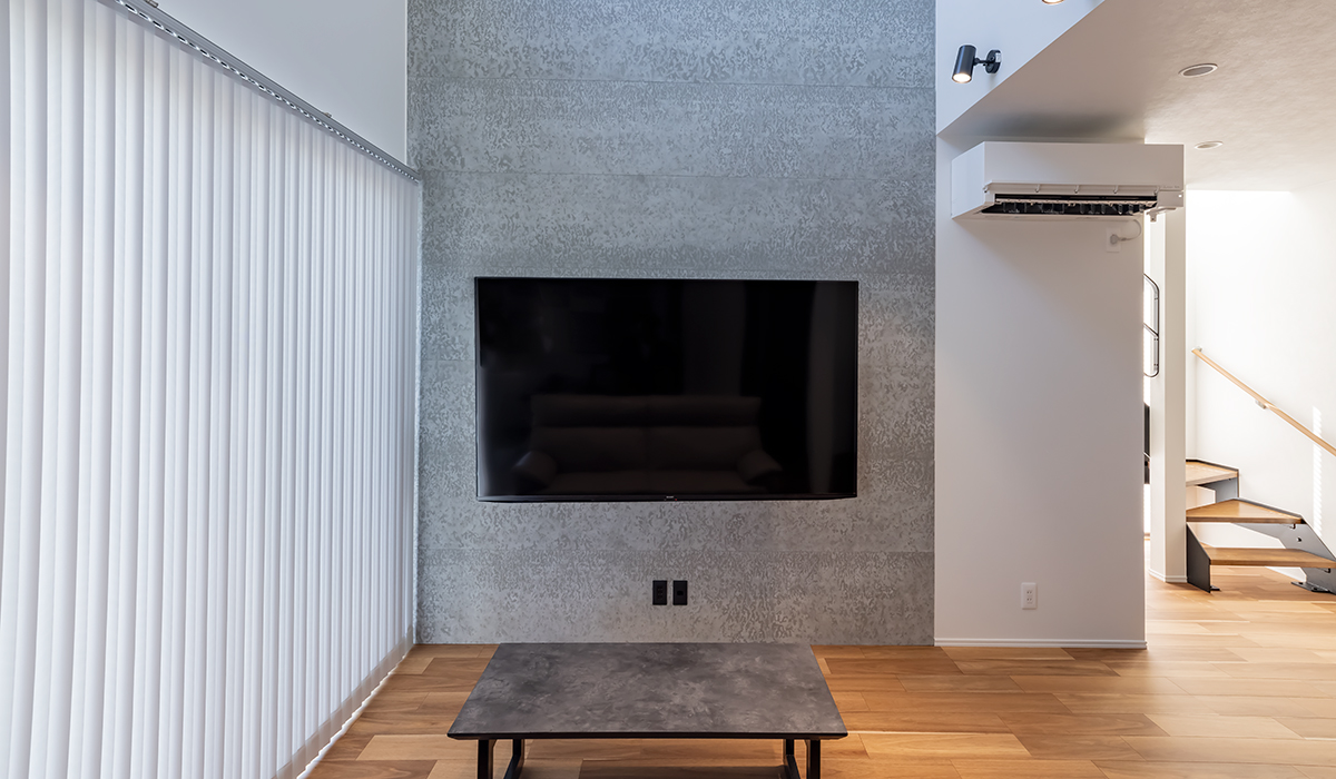 グレーとブラックでトーンを統一し、異素材の組み合わせを引き立たせました。ニュアンス感をFDPとSOLIDOで表現し、光セラ18を組み合わせ陰影を出しています。また、内装の吹き抜け部分にSOLIDOを使用し落ち着きのある空間を演出しました。