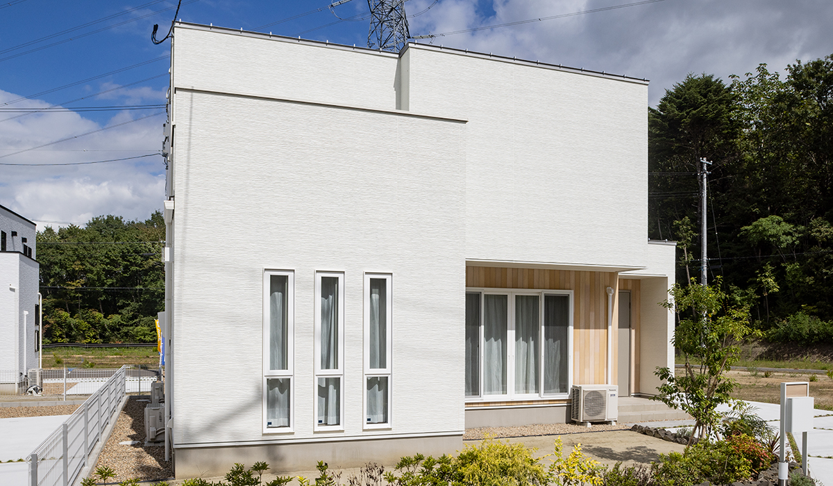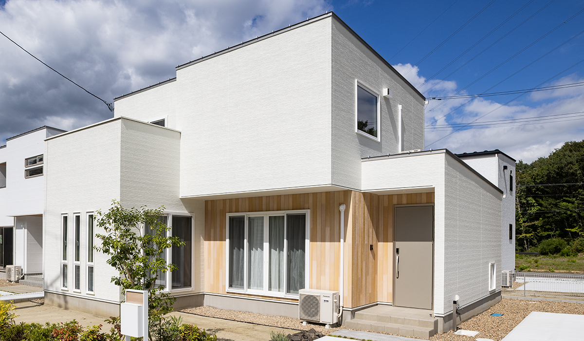 凹凸のある正面デザインを基調とした家。シンプルモダンでありながら、木目調アクセントで温かみのあるやさしい印象を与えるデザイン。