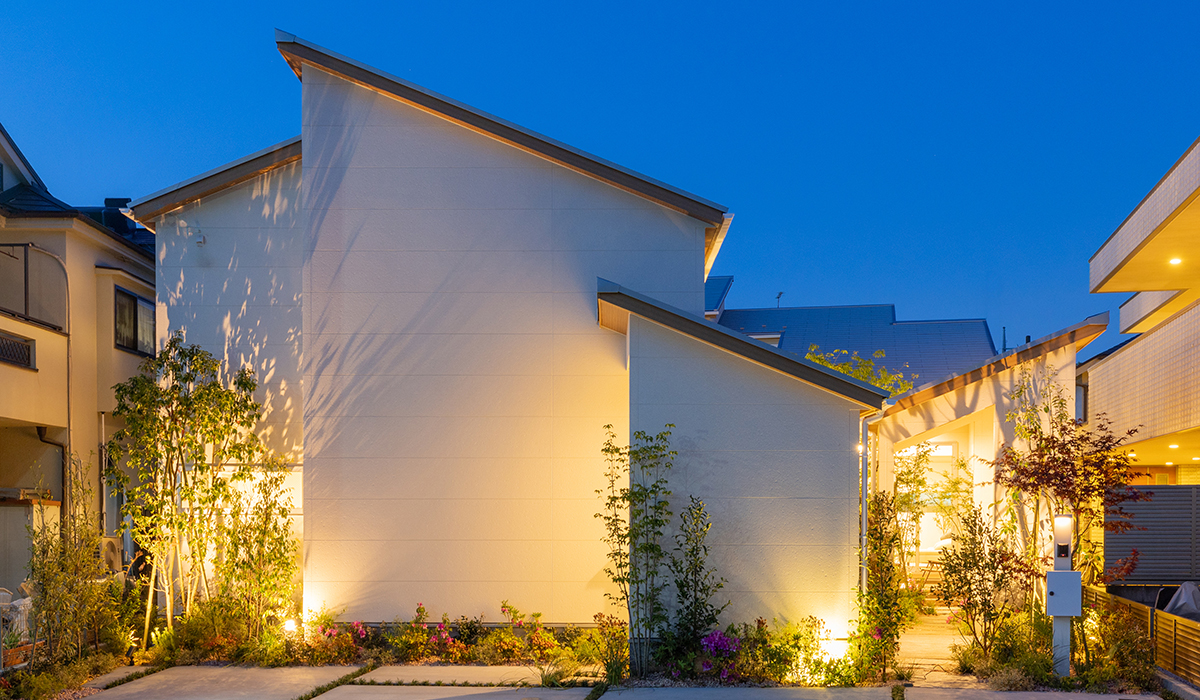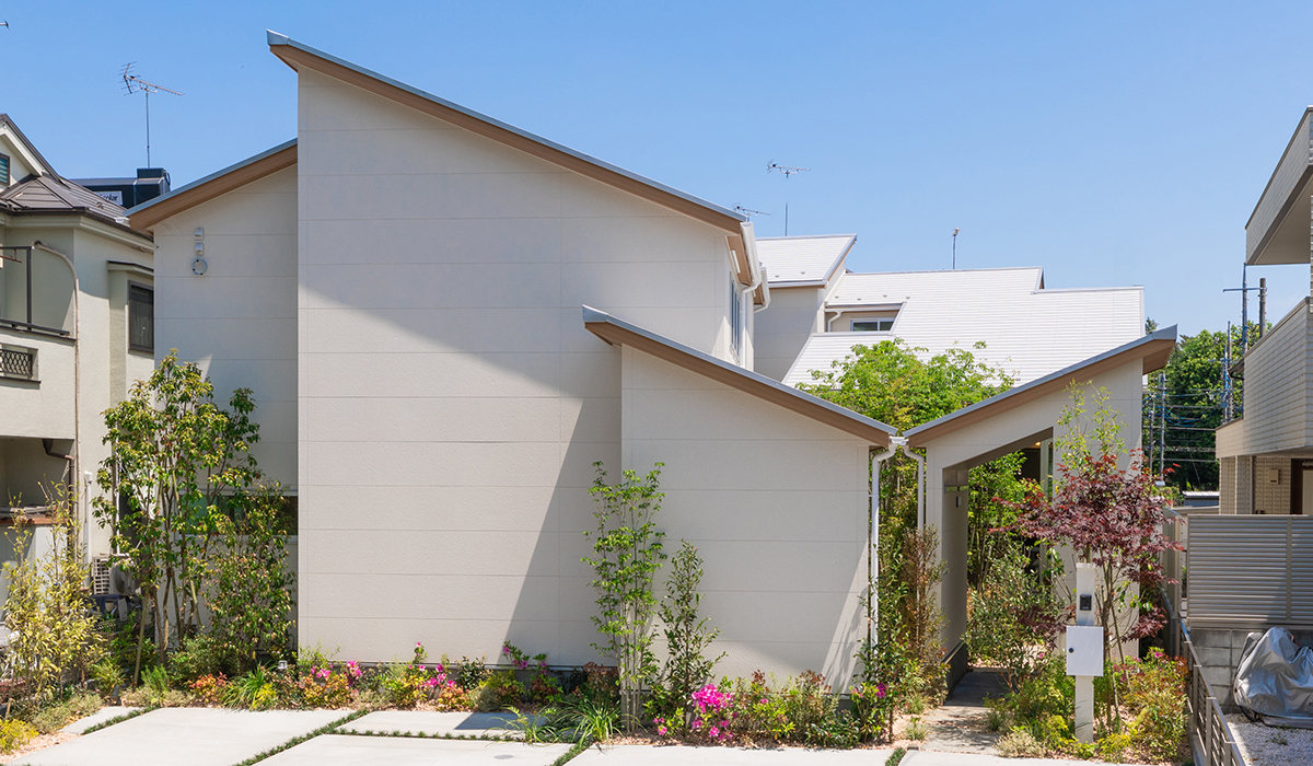 旗竿地2棟現場での採光確保のため、中庭を中心としたすり鉢状の建物配置を採用。街並みと調和しつつプライベート空間を確保した設計と、白を基調としたシンプルな外観に緑が映えるデザイン、庭やテラスの空間設計により住む人にとって快適かつ開放感のあるデザインが特徴である。
