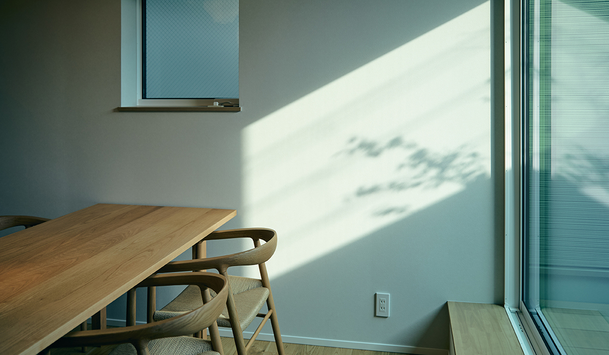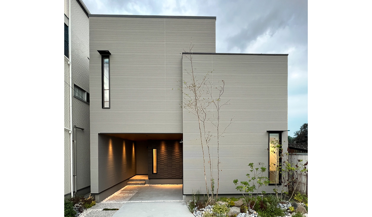 スクエア型の2つのBOXがシンプルなグレーの外観にたて長窓が映える住まいです。 小さな敷地でもビルトインガレージがアプローチに奥行きを感じさせてくれます。 かっこよさと暮らしやすさを両立し、誰もが親しみを感じられるデザインです。