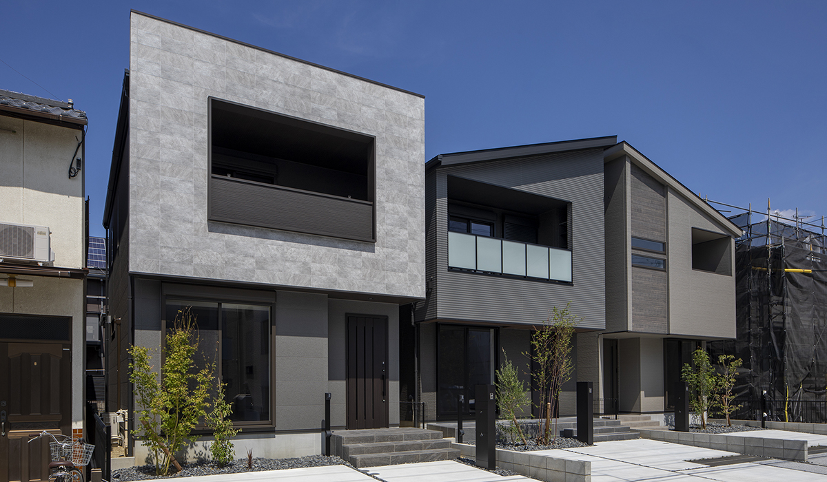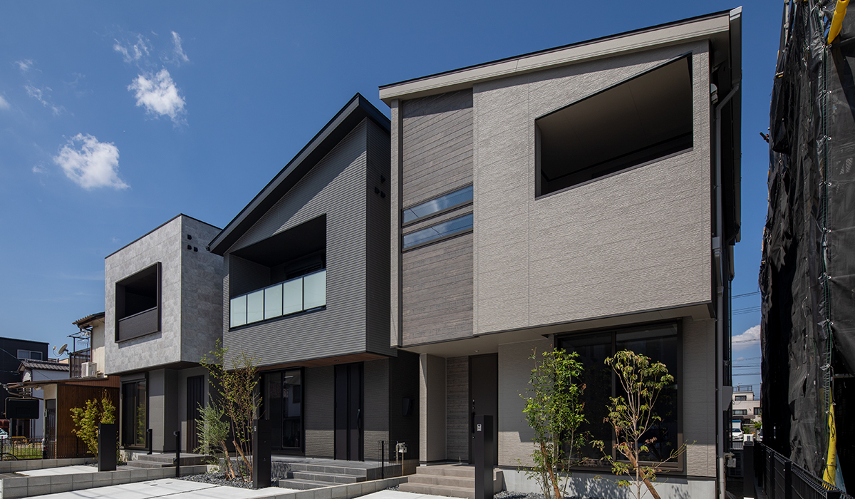 シックな色合いで統一された3棟の住宅群。外壁の色味や外構デザインを揃えることで、視覚的に間口が広がり、街並みに落ち着きと品格をもたらす。各住宅の駐車スペースは、単なる駐車場ではなく、小さな公共広場のように存在し、街全体に視覚的な余白が生む心地よさを添えている。
