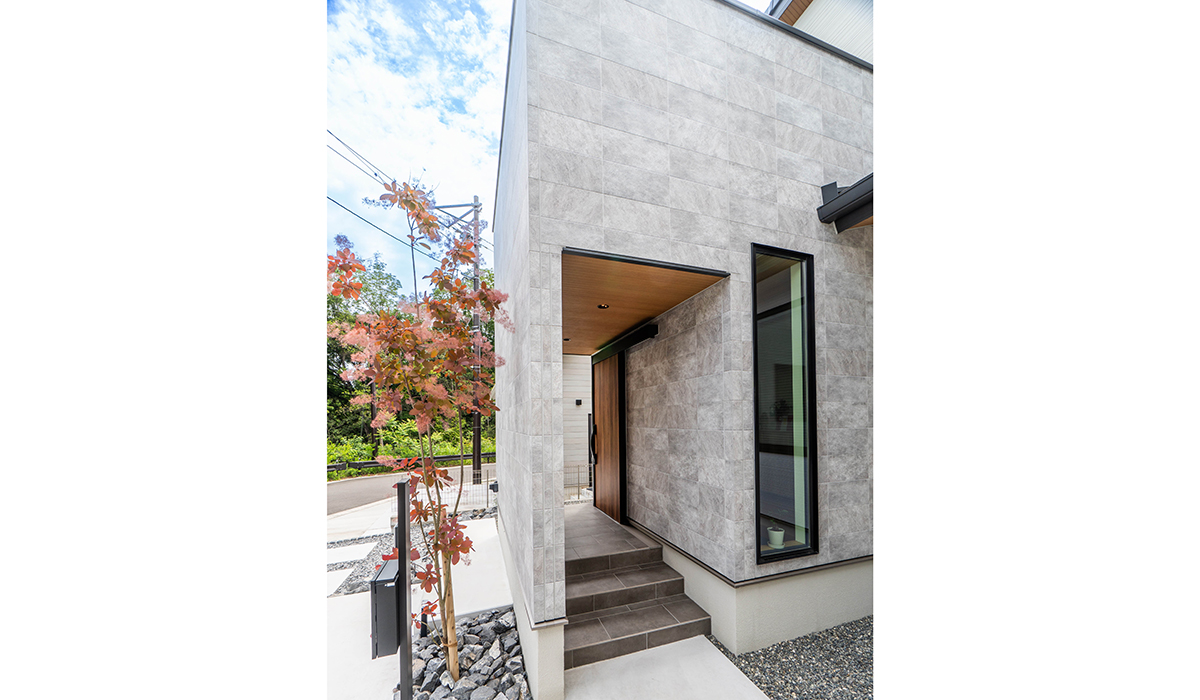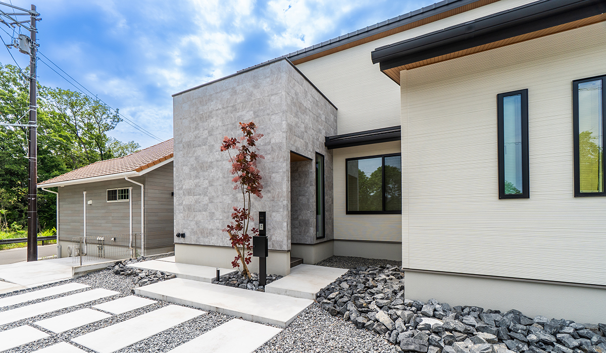 シンプルモダンを極めた洗練の邸宅。大判タイル調外壁が上質な表情を生み、無駄をそぎ落としたラインと落ち着いたカラーが普遍の美を演出。白いスラブと化粧砂利が足元から高級感を添え、静かな誇りと存在感を放ちます。