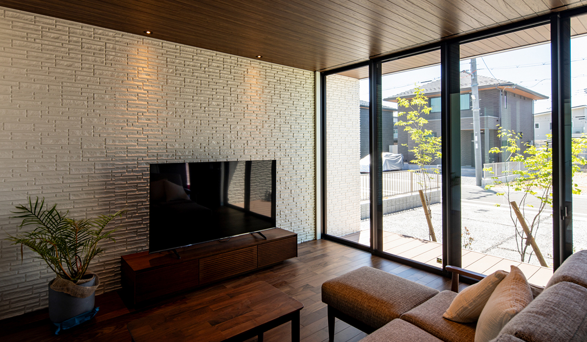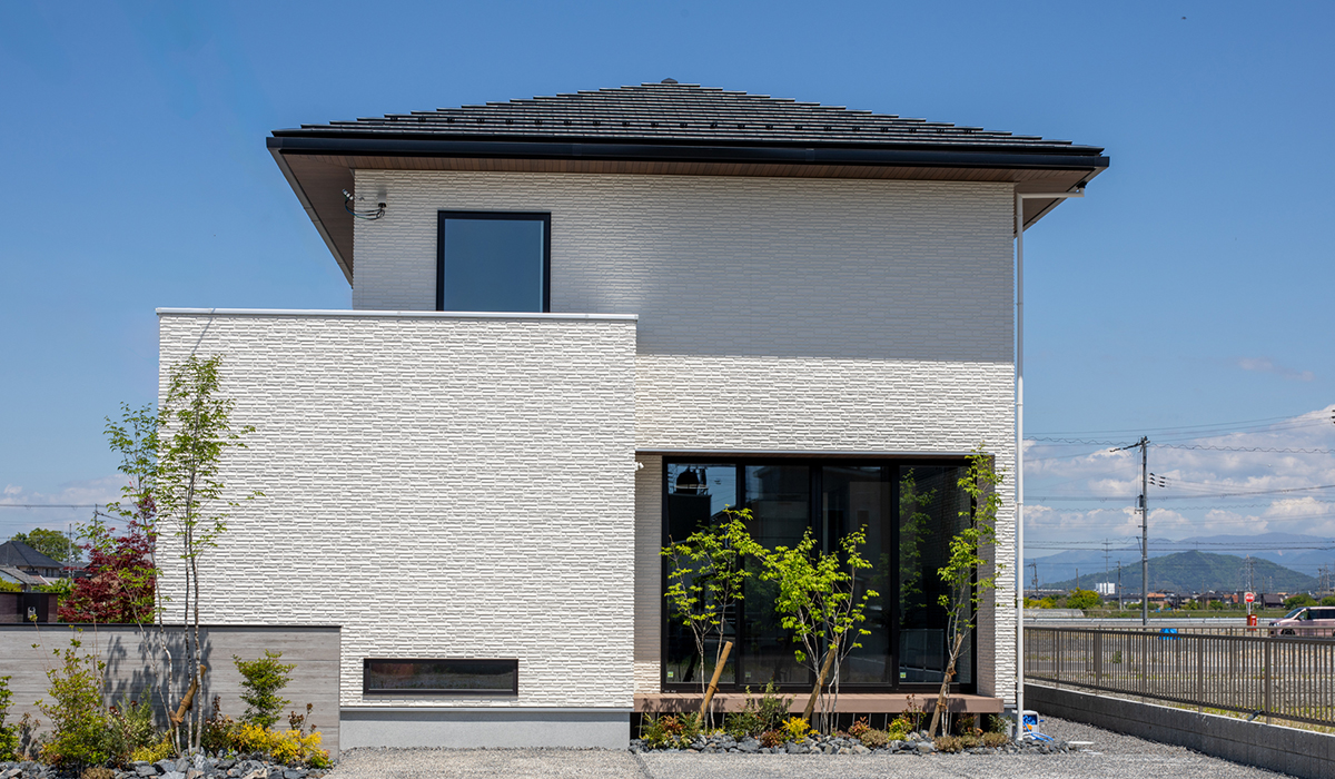 「内」と「外」が溶け合うような暮らし。リビングと庭が緩やかにつながることで、空間に広がりと奥行きを与え、日常の中に豊かな変化が生まれます。室内の壁と外壁を同じ外壁でつなげることで「内」と「外」が溶け合い、より内部空間の広がりを感じることができます。