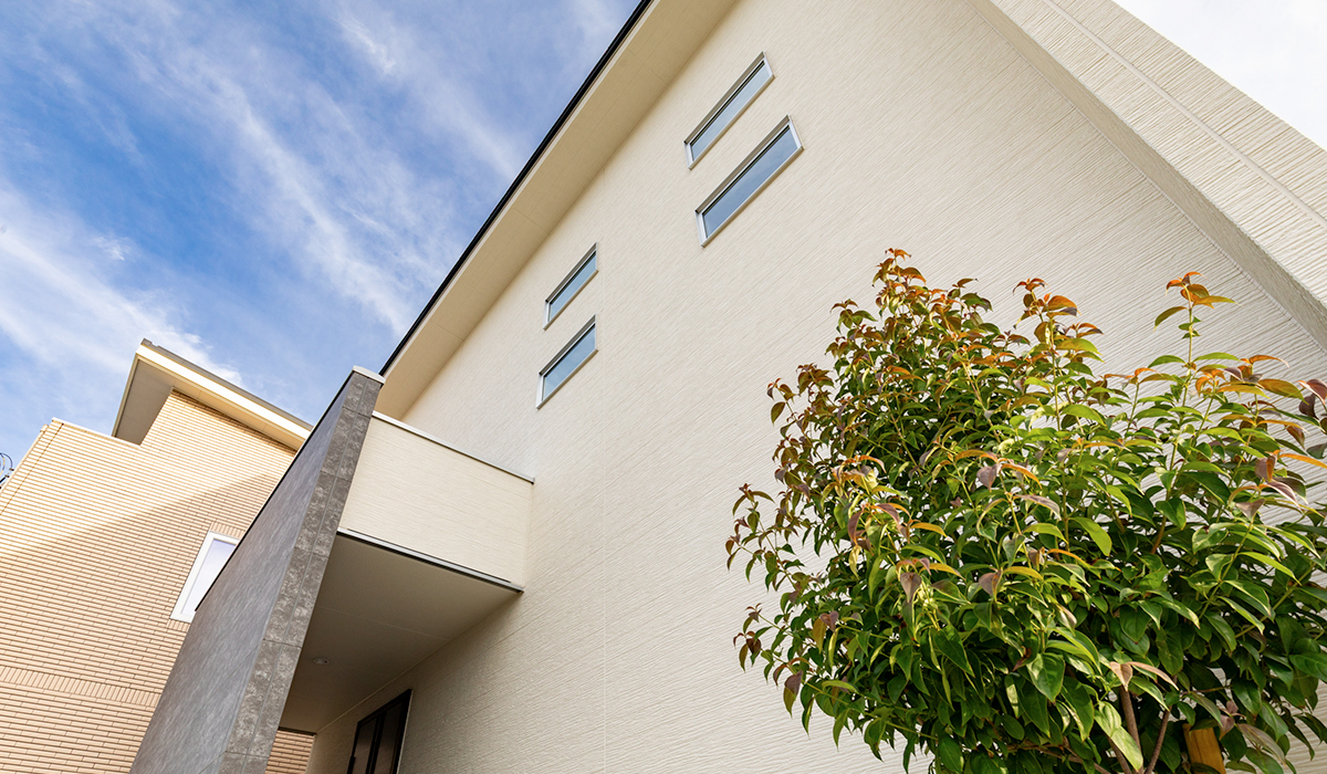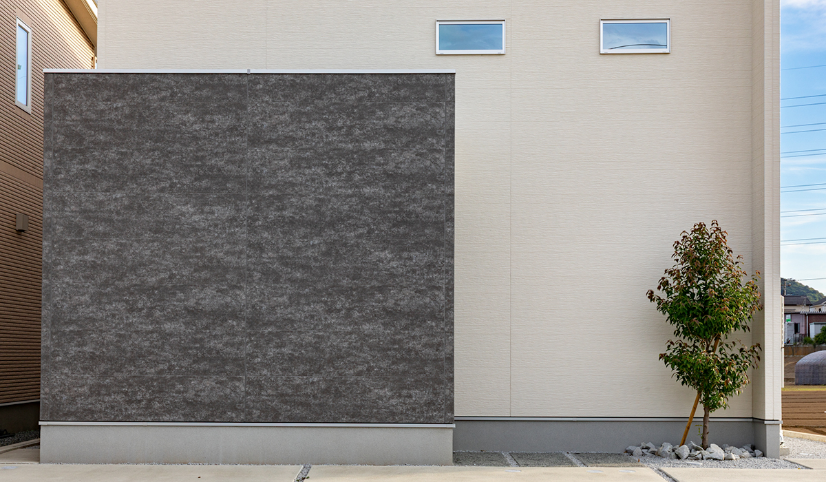 超ローコストながらデザイン性にこだわり、無駄を削ぎ落としたシンプルでスタイリッシュな外観に仕上げました。またアクセントとしてケイミューの外壁材「フィエルテ」を採用することで深い陰影と質感で上質感を演出しました。