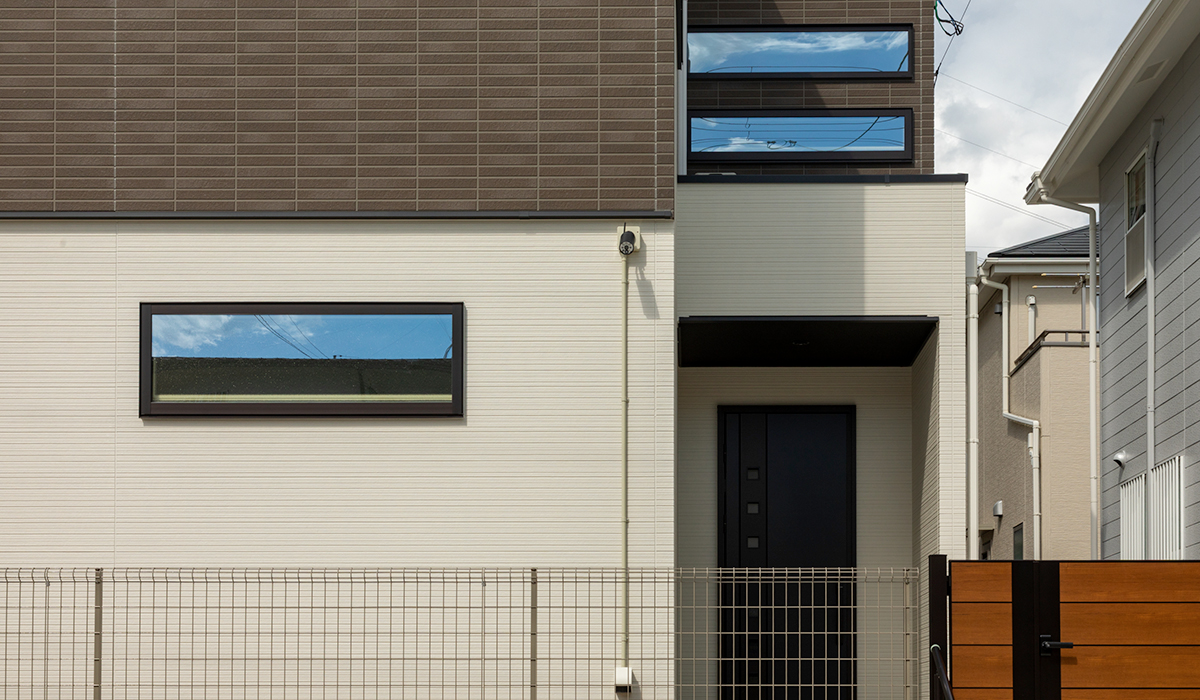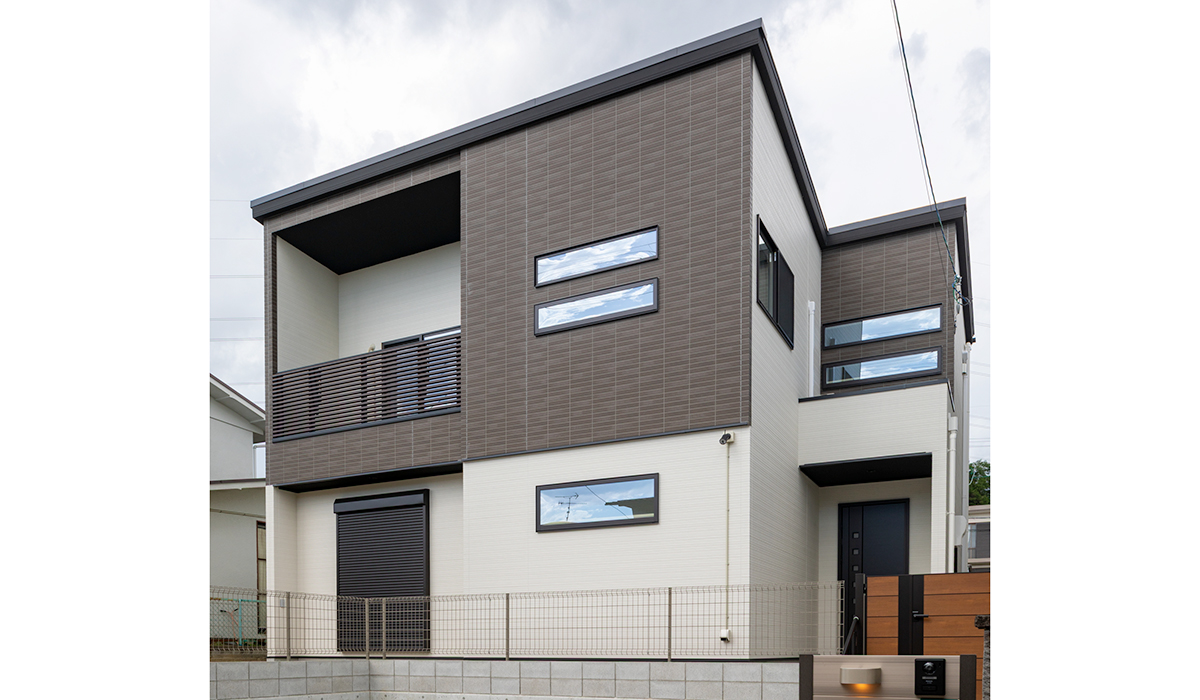 14mmサイディングのコストメリットを活かしつつ、ふかし壁やパラペット、横長サッシ、スクリーンなどを巧みに組み合わせ、上質感とデザイン性を両立。限られたコストの中で工夫が光る外観に仕上げました。