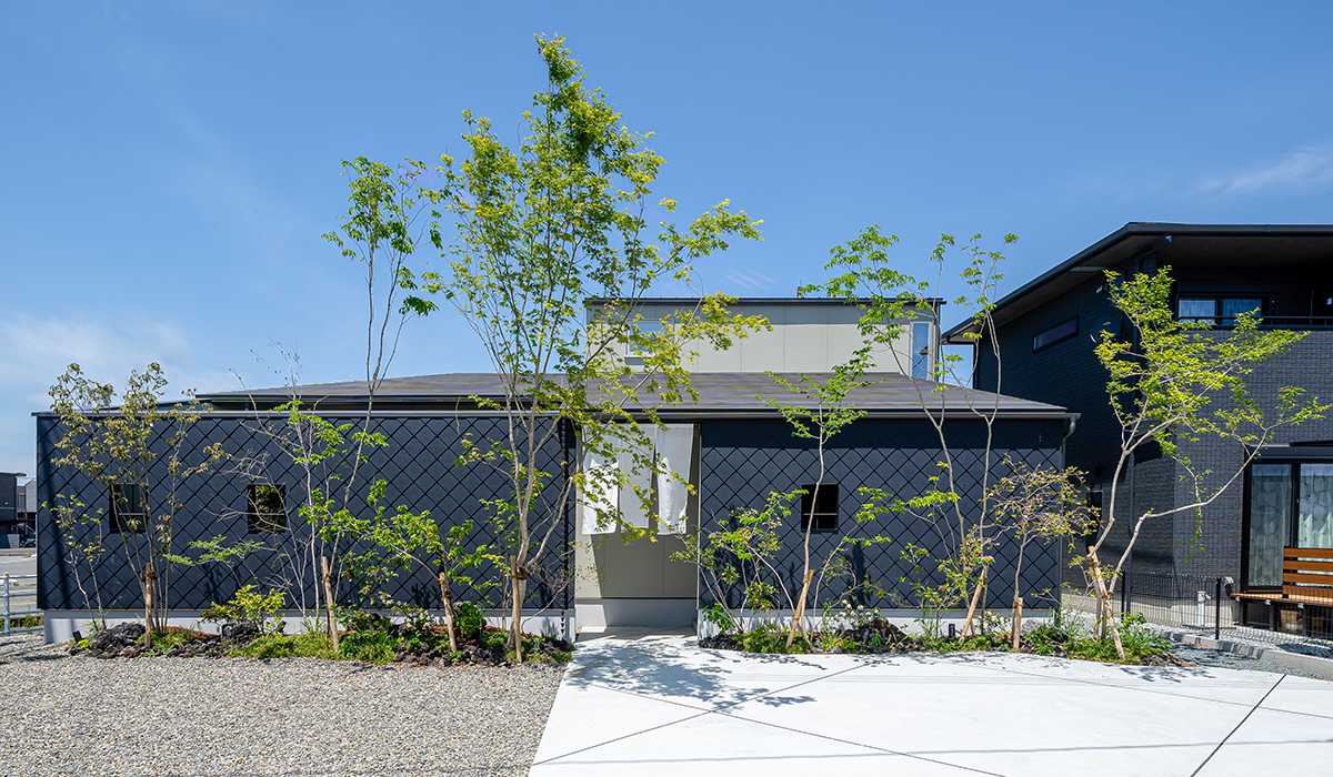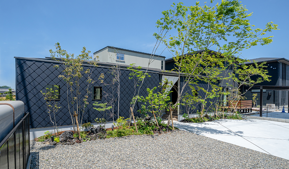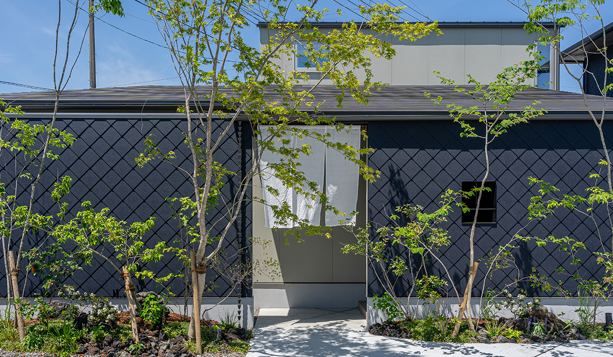 由緒ある神社や歴史ある街並みに溶け込む和洋折衷の住まい。現代的にシャープな形に、伝統的なひし形外壁「ヒシ」と藍色を纏い、小窓でヌケを、歴史と現代が調和するファサードデザインとした。