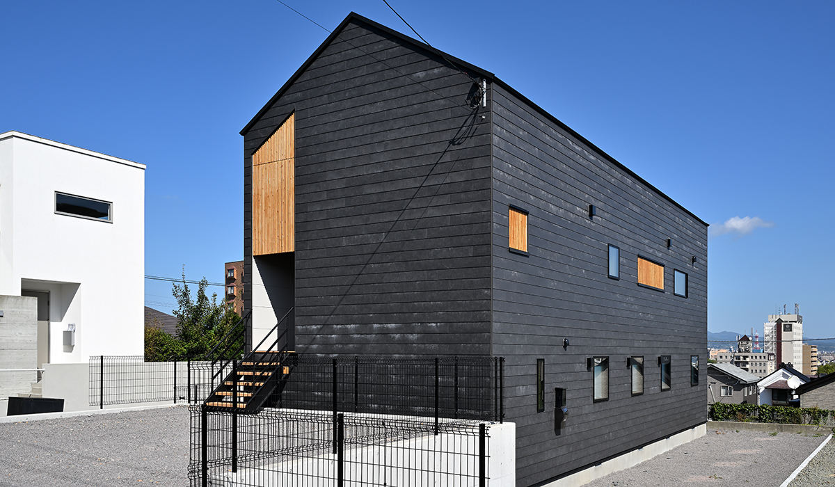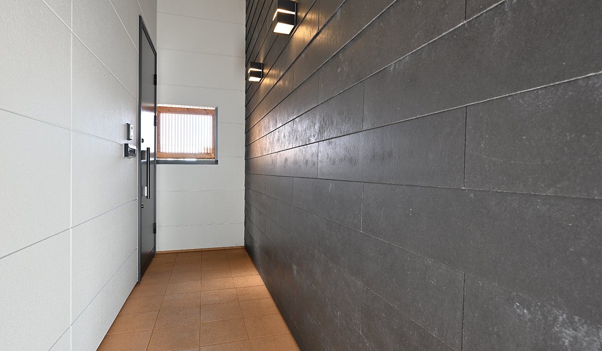 自然の風合いの残る素材、石材と木材の組み合わせを考え、SOLIDOの色も木材との色、梨地との組み合わせ方を最後の最後まで悩み検討致しました。正面には窓や換気フードなど設けずに、SOLIDOが全面に見える様細部までこだわった物件です。