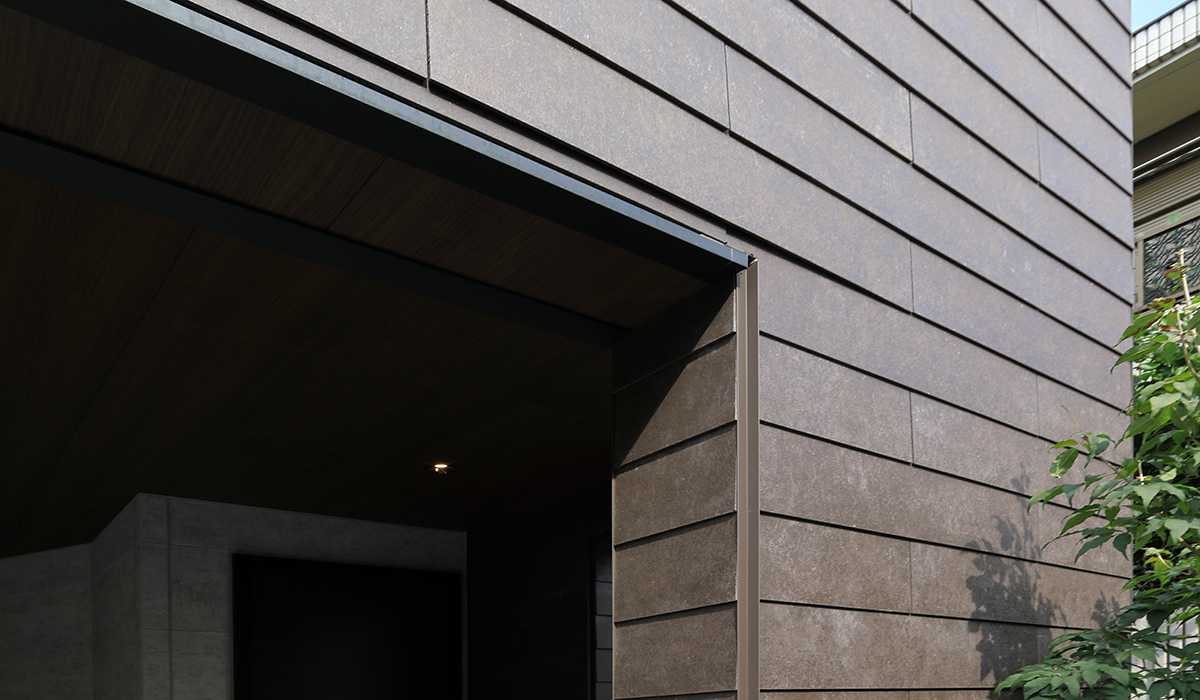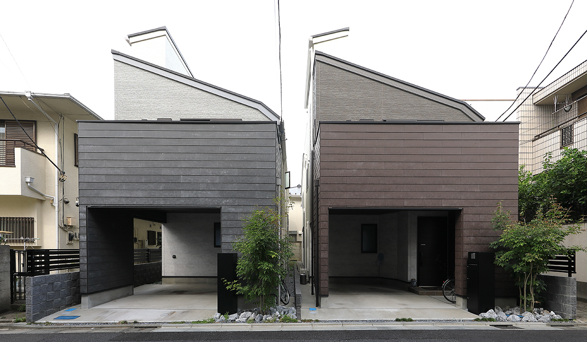 建物はシンプルな形ですがSOLIDOを使用することで重厚感を出しました。色は灰・錆茶の対照的な色合いにすることで同じ形でも雰囲気 の違う建物になりました。なかなか分譲住宅では見かけないSOLIDOを採用し、個性と存在感のある街並みに仕上がりました。