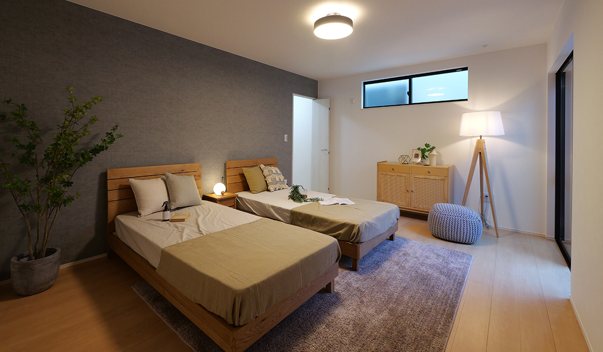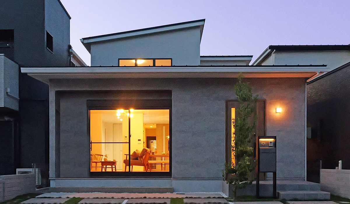 平屋の快適さと2階建ての機能性を融合した『準平屋』。そのコンセプトが体現された、水平ラインを強調したフォルム。外観には、力強く洗練された印象の打ち放しコンクリート調の外装材を採用し、木目調の玄関ドアと組み合わせ、スタイリッシュでかつ温かみのある外観に仕上げた。