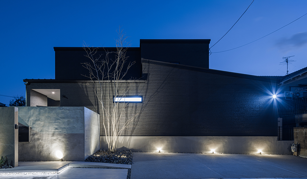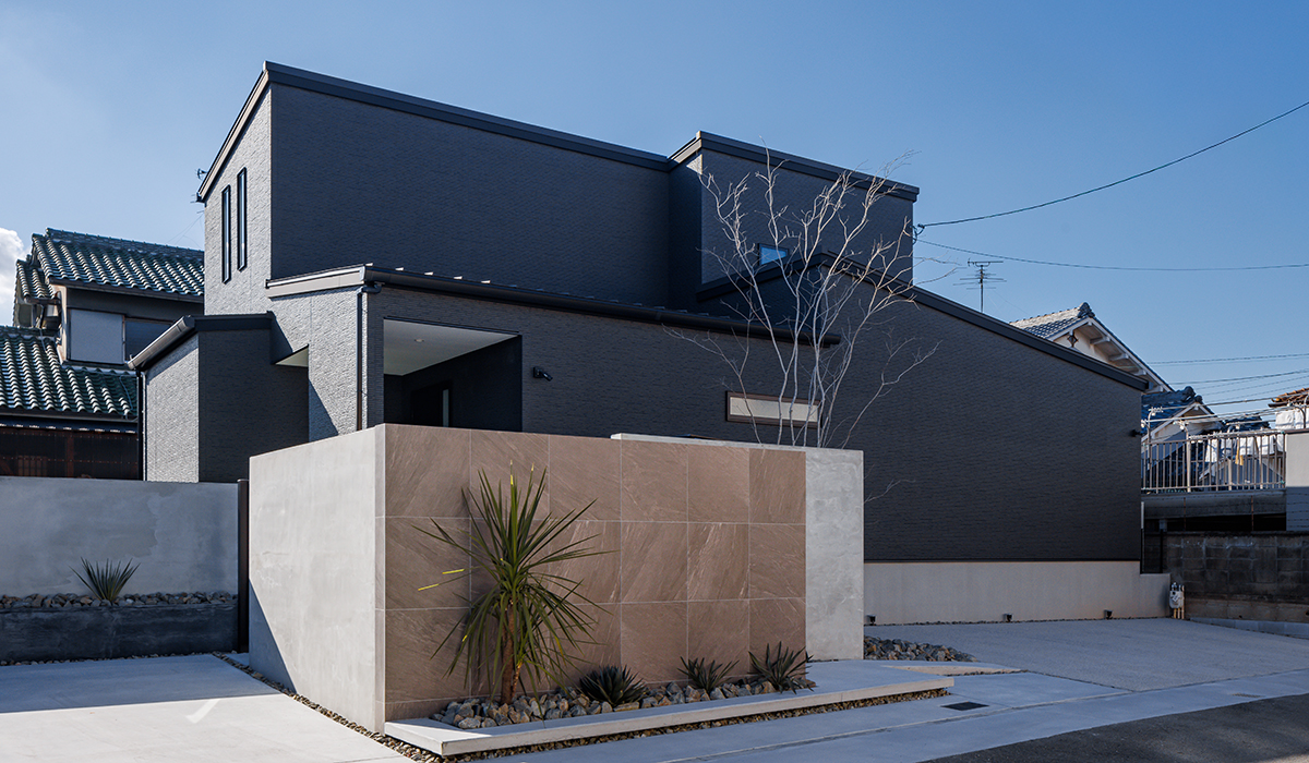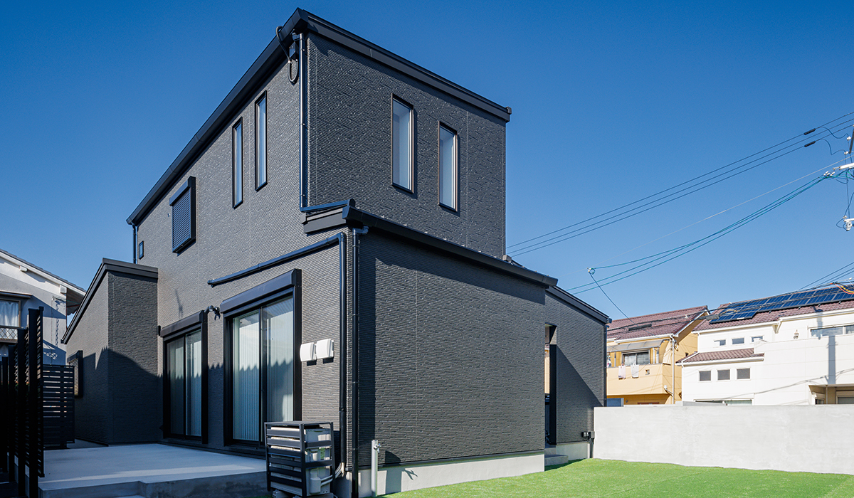 張り分けをせずブラック一色で統一し、シンプルで端正な外観に。異素材のタイルが黒の質感を引き立て、飽きがこず上質な佇まいを演出しています。