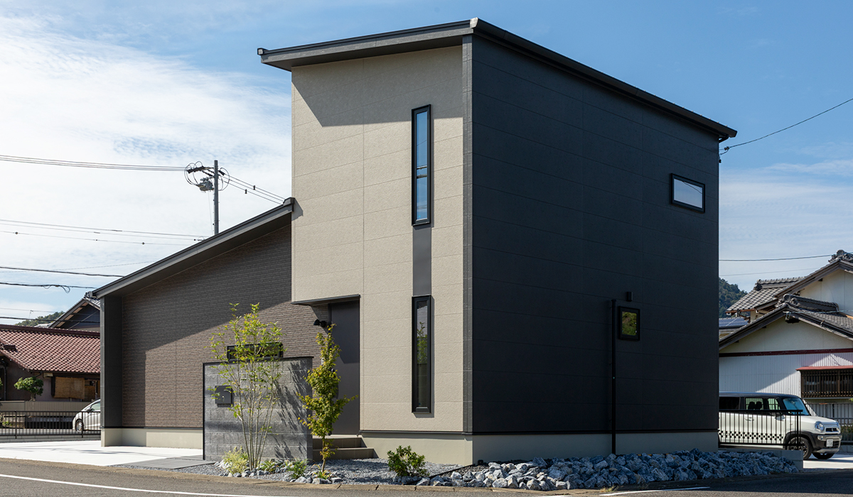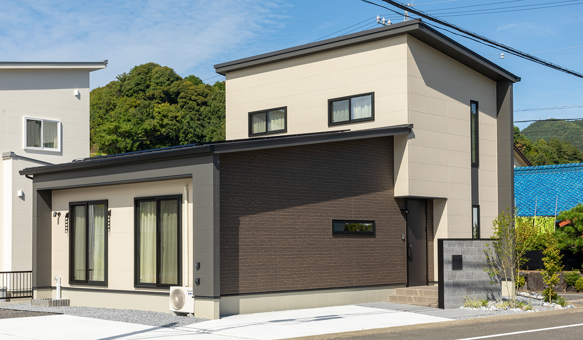 将来を見据えた平屋+ちょこっと2階の住まい。ベージュを基調に黒と茶が差し色の、優しさとモダンさが調和する外観です。角地ならではの広がりを活かし、東側を住まいの顔とする配色計画で開放感と存在感を演出。街並みに調和しつつ、訪れる人の目を惹きつける一邸となりました。