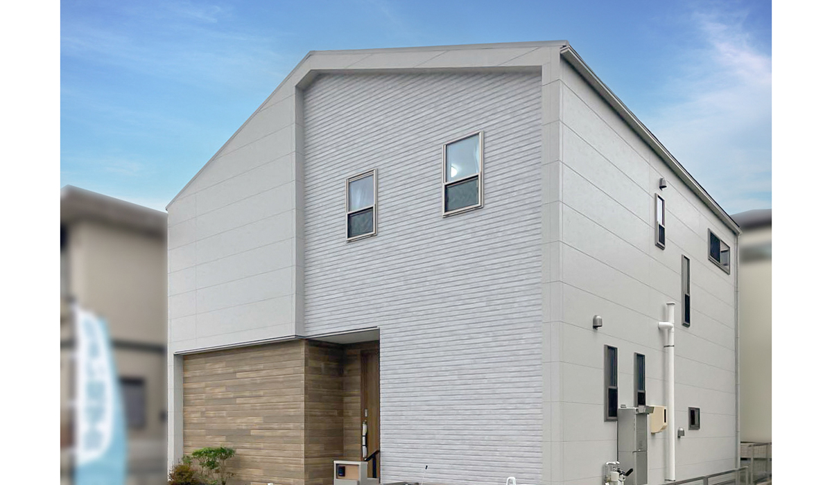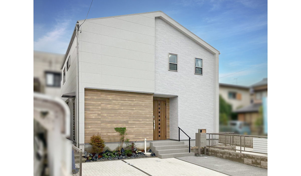 同色の異なる素材をあえて組み合わせることで、質感の違いが互いの持つ表情を引き立て合い、建物に陰影と奥行き感をもたらします。濃淡のある木目柄の外壁材に植栽を調和させ、シンプルながら存在感のある外観に仕上げました。