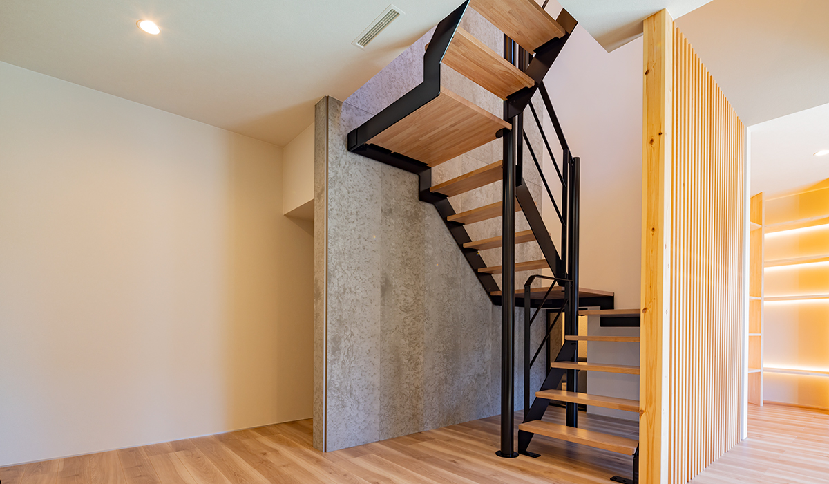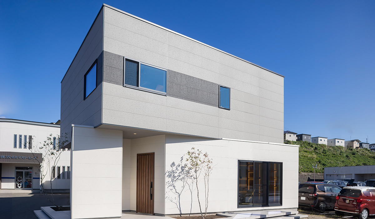 「この建物、なんだか気になる・・!」建物自体が会社の看板になるように、どこから見たらキレイに、そしてインパクトをもって見ていただけるか、視界ボリュームをどこに置くかを考え、上下階をズラし「ねじれた」デザインで、見る方向によって印象が変わる外観にしています。