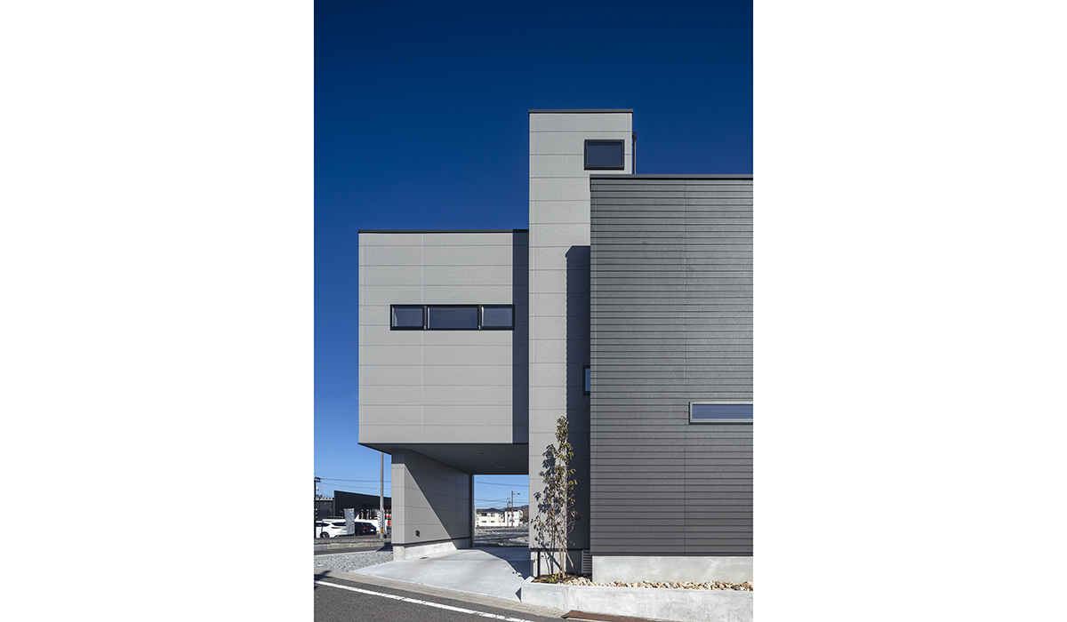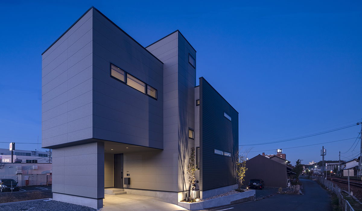 敷地面積40坪の狭小地に建つ専用住宅です。 変形敷地に沿うように階段を中心に平面計画で左右のズレを設けました。 階段と左右のズレから生まれるフォルムに高さや色、素材に変化を与え、間取りは総2階ですが、リズミカルで奥行感のあるコンパクト住宅となりました。