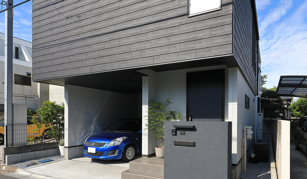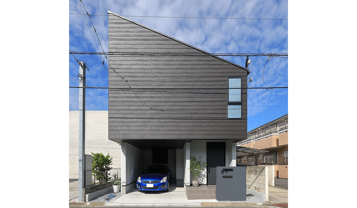 オーバーハングした建物ボリュームがダイナミックで存在感を感じさせるデザイン。 LAP-WALL Woodのブラック色とエルデフラットのライトグレー色のシンプルなモノトーンの配色とする事で、LAP-WALL Woodを引き立たせるよう計画致しました。