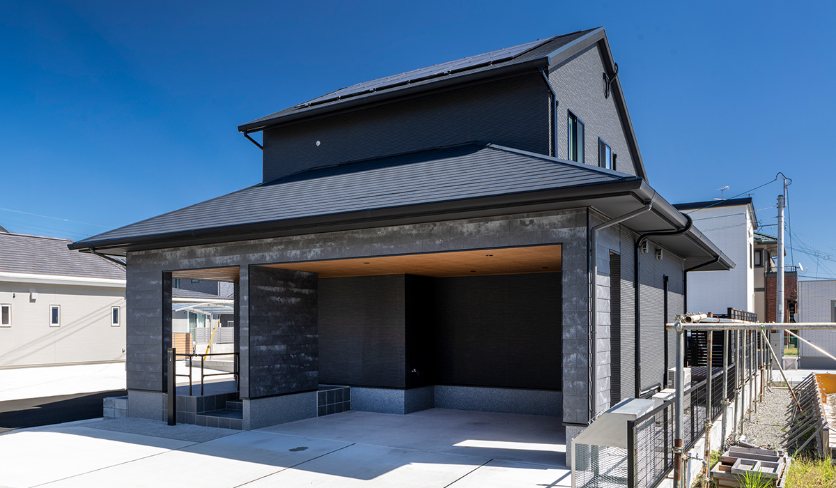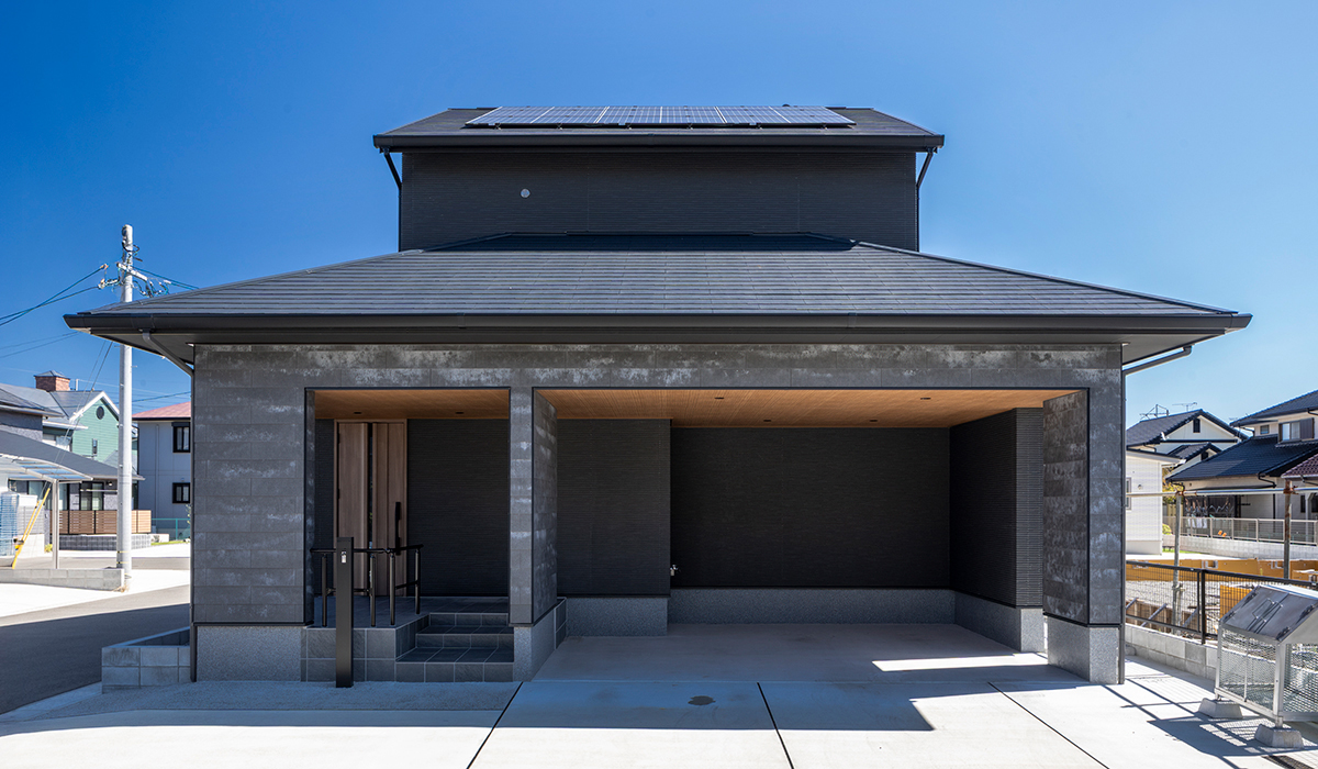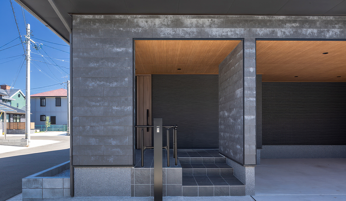 SOLIDO「灰」をベースに、シックな外観がお好みであった為、より黒くしかしテクスチャはシンプルにする為ハーモレイドを選択しました。 夜、愛車で帰宅した際に気分があがるようなガレージを目指したので、照明計画でより外壁が映えるような計画としました。