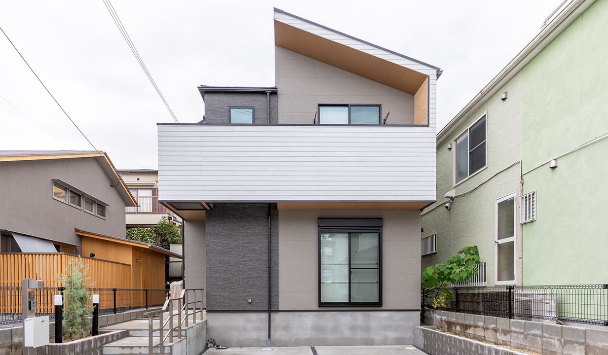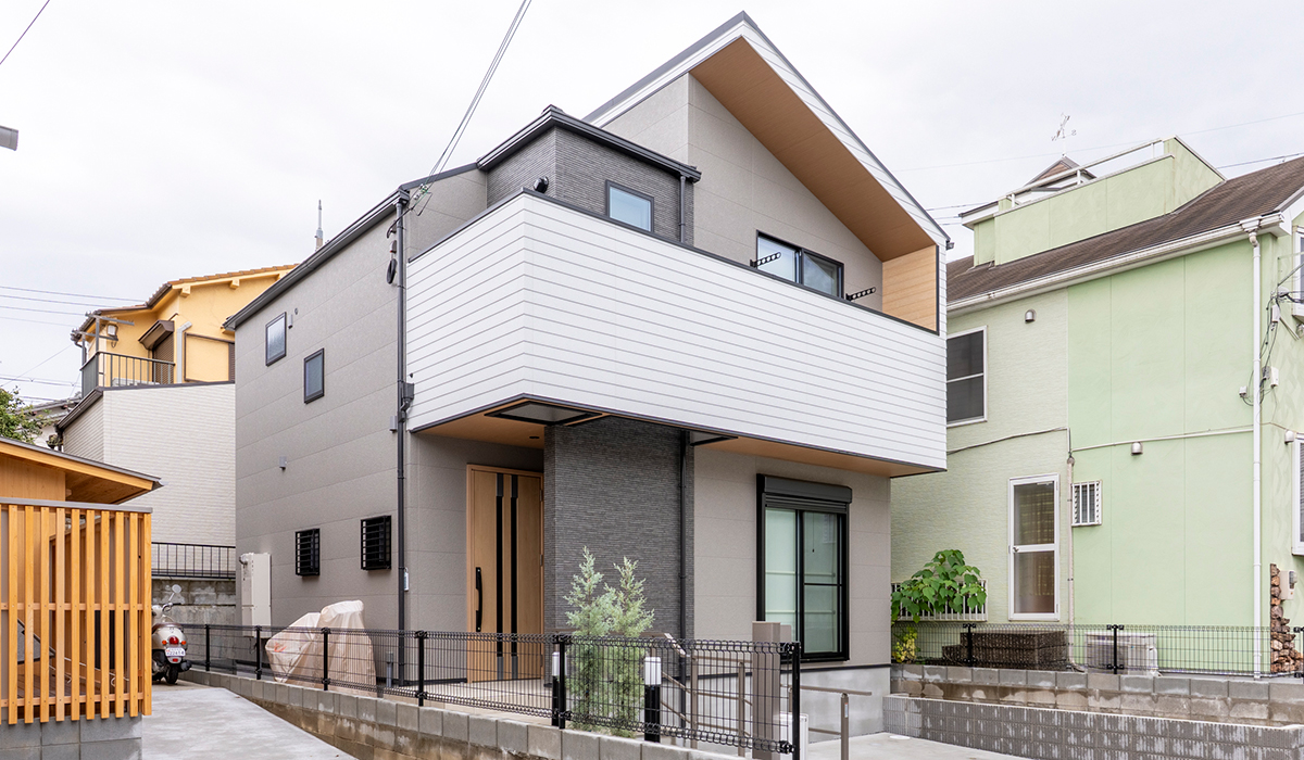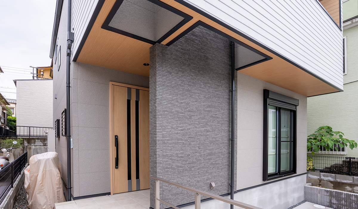 様式はスタイリッシュモダンとし袖壁と片流れ屋根を一体化、ボリューム感のあるファサードとしました。白のラップ調サイディングを基調に木調やグレーでコントラストをつけ、軒天にも木目調を採用して温かみをプラスしました。