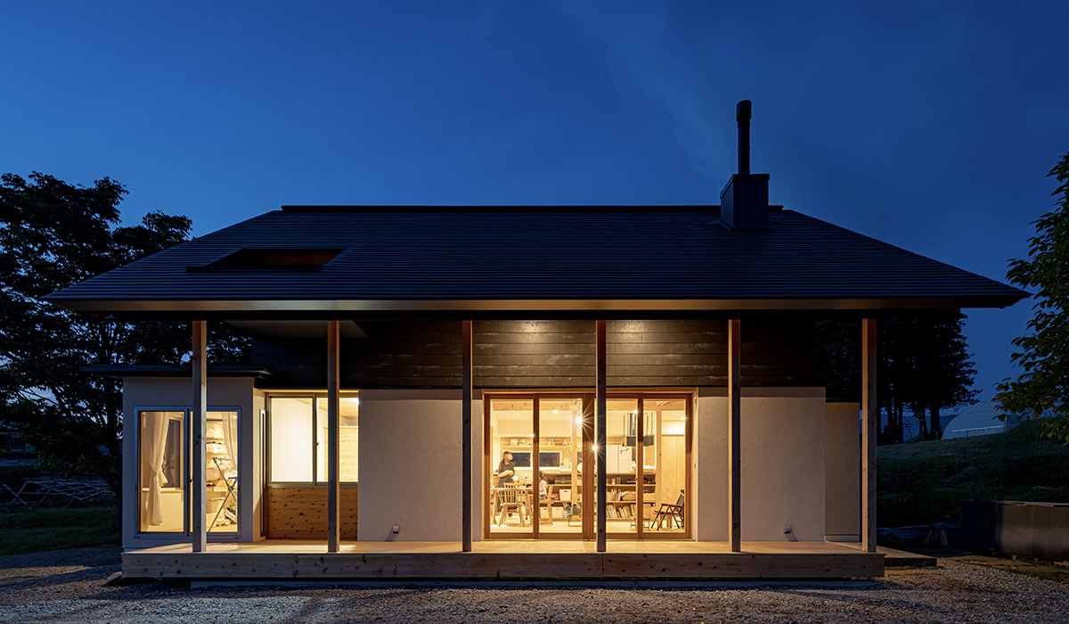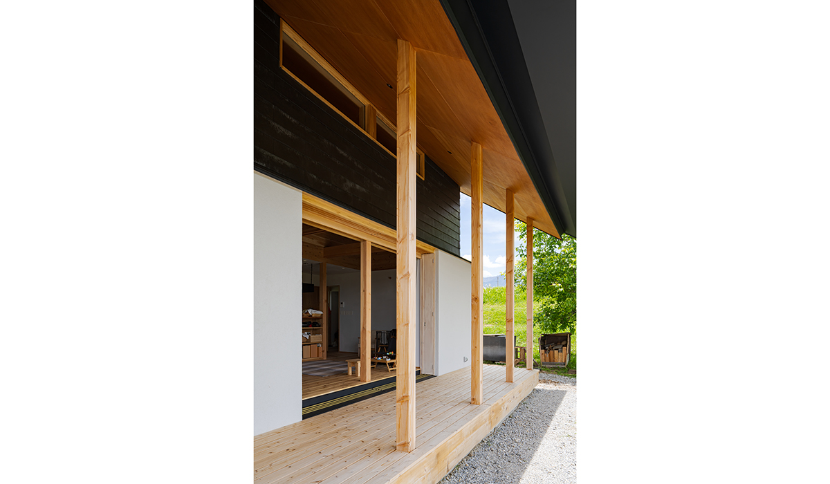 八ヶ岳の裾野の田園が拡がる敷地へ住宅を設計しました。内と外が一体に感じられる「小さな家の大きなくらし」を設計のテーマとしています。一つ一つの要望に丁寧に応えていった結果、敷地周辺に見られる倉と近い姿となり、風景の中に溶け込んでいくような建築となりました。