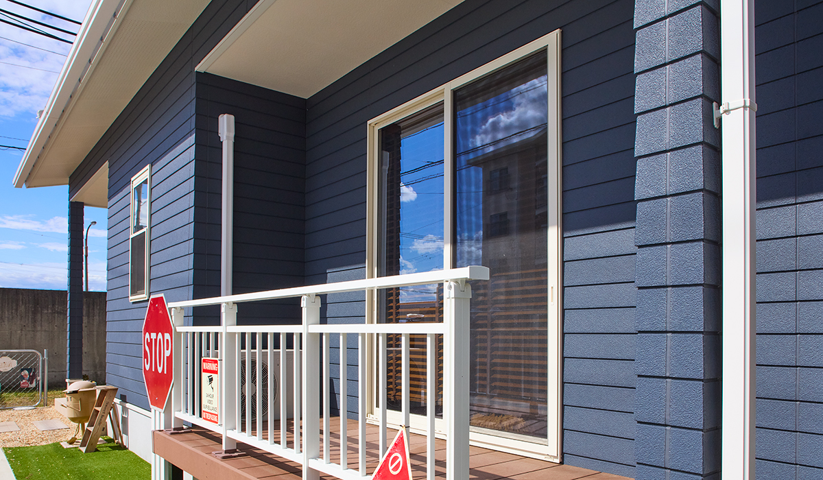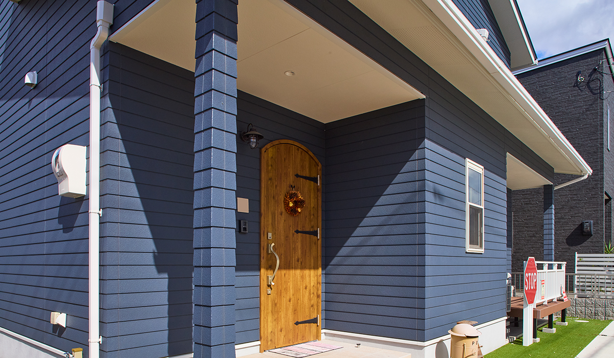 深みと鮮やかさを兼ね備えたブルーが主役の、お洒落なカリフォルニアスタイルのおうち。冒険カラーながら、木目調ドアや白の窓枠、アイアン装飾との調和により、住宅街に溶け込みつつ印象的な存在感を放つ外観に仕上げました。