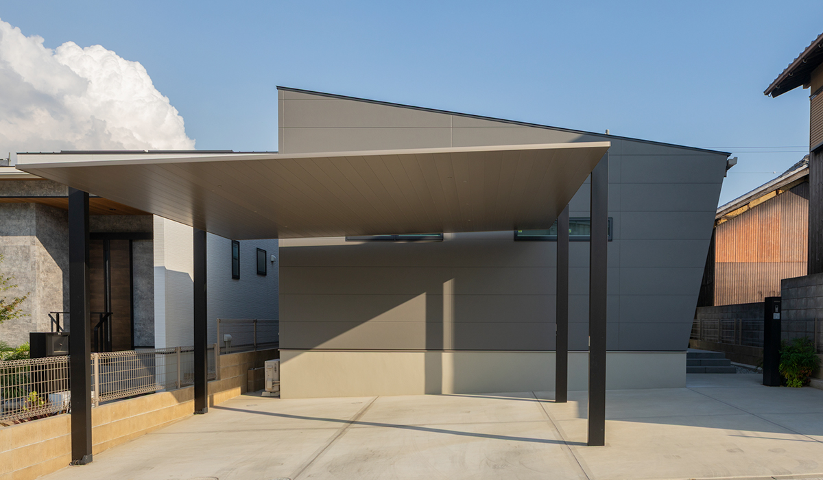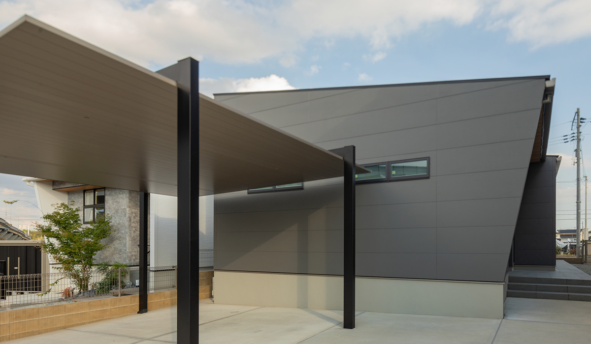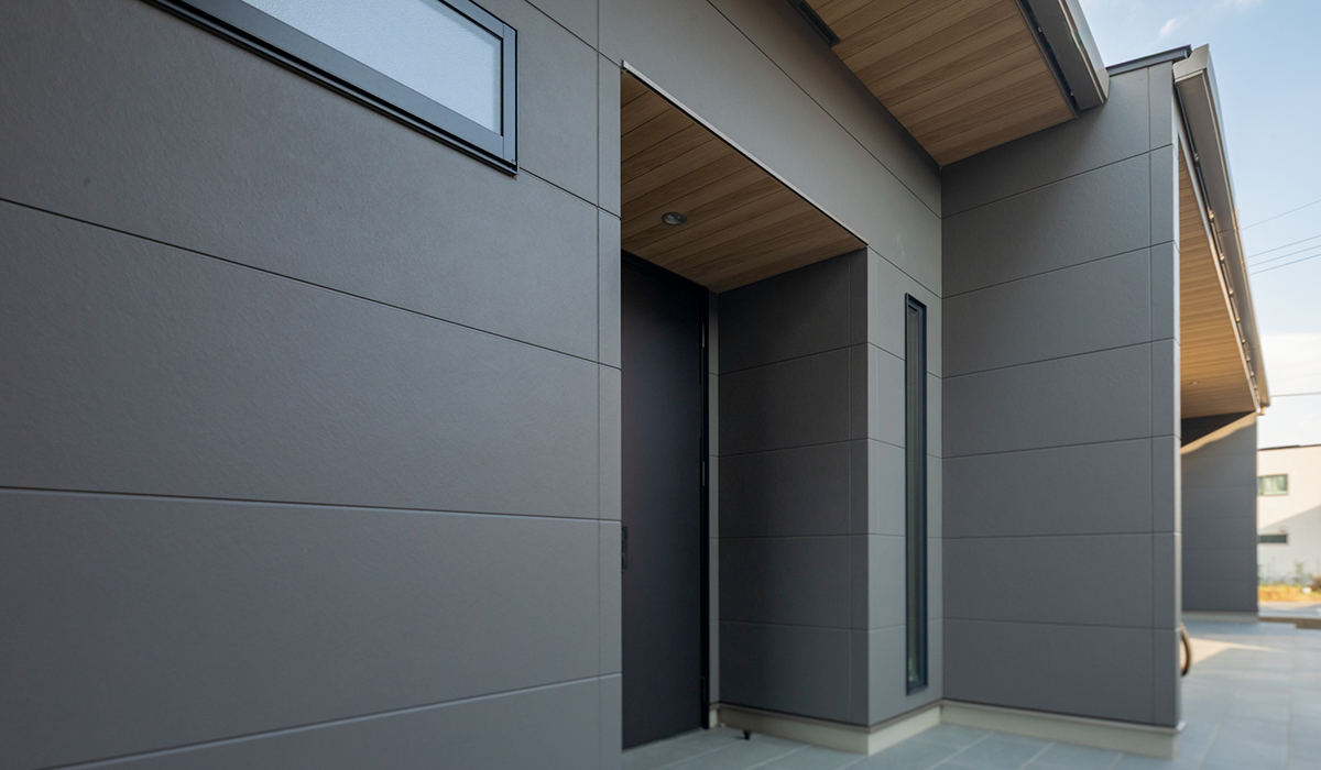 洗練された片流れ屋根とフラットサイディングが特徴の平屋。掃き出し窓に続くタイルデッキは、深く出した軒により夏は日差しを遮り、冬は陽光を取り込みます。シンプルながら機能性と美しさを両立し、季節を問わず快適に暮らせる、永く愛される住まいです。