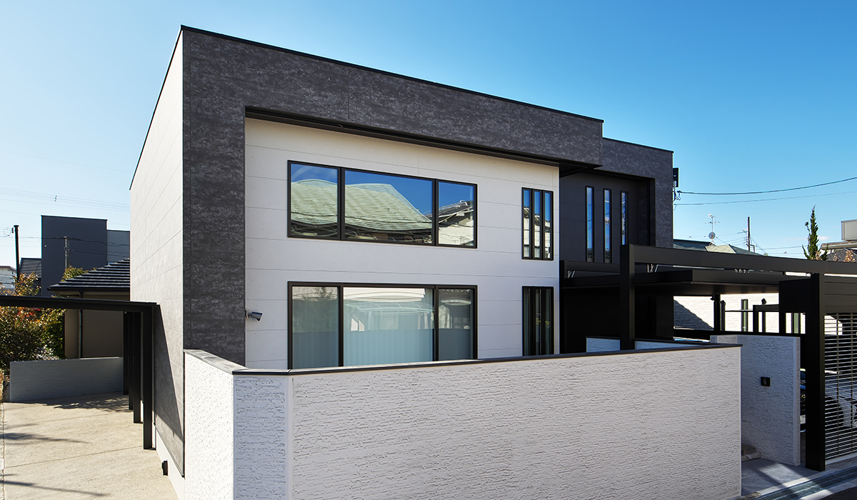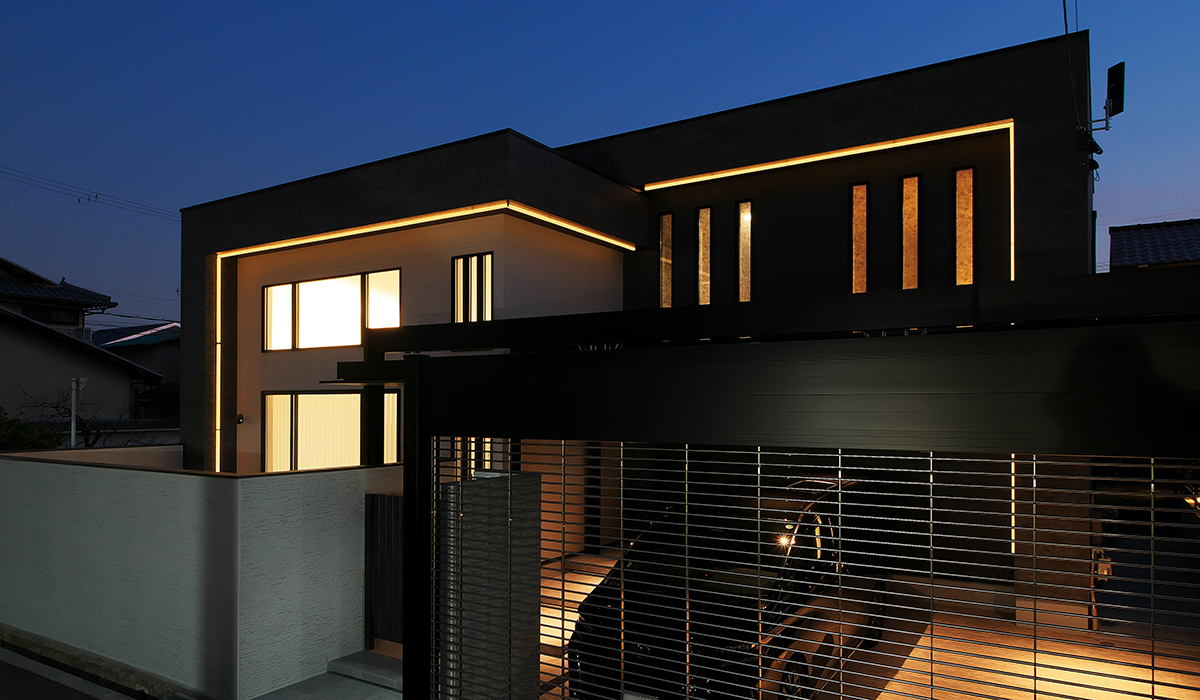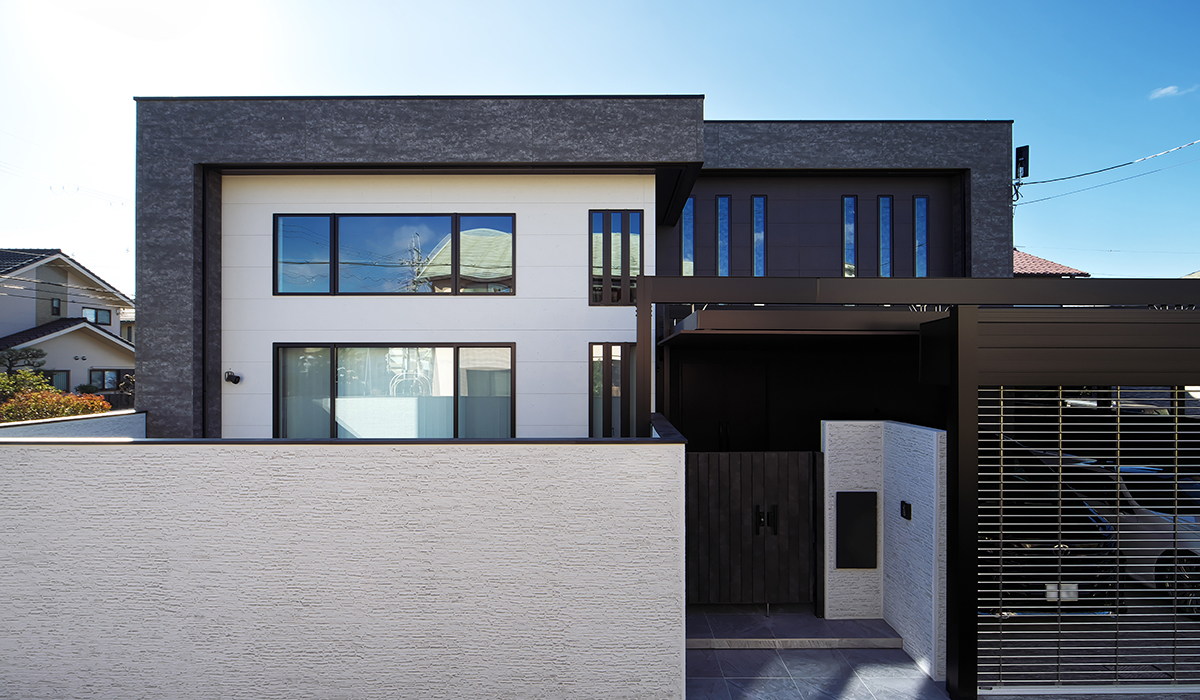 見る角度によって豊かな陰影を生み出す深彫りのようなデザインになるよう、素材感にこだわった。重厚感と高級感をあわせ持つ圧倒的な存在感をめざした。どの角度から見ても立体感とシャープなラインが美しく「かっこいい家にしたい」という施主のこだわりを叶える結果となった。