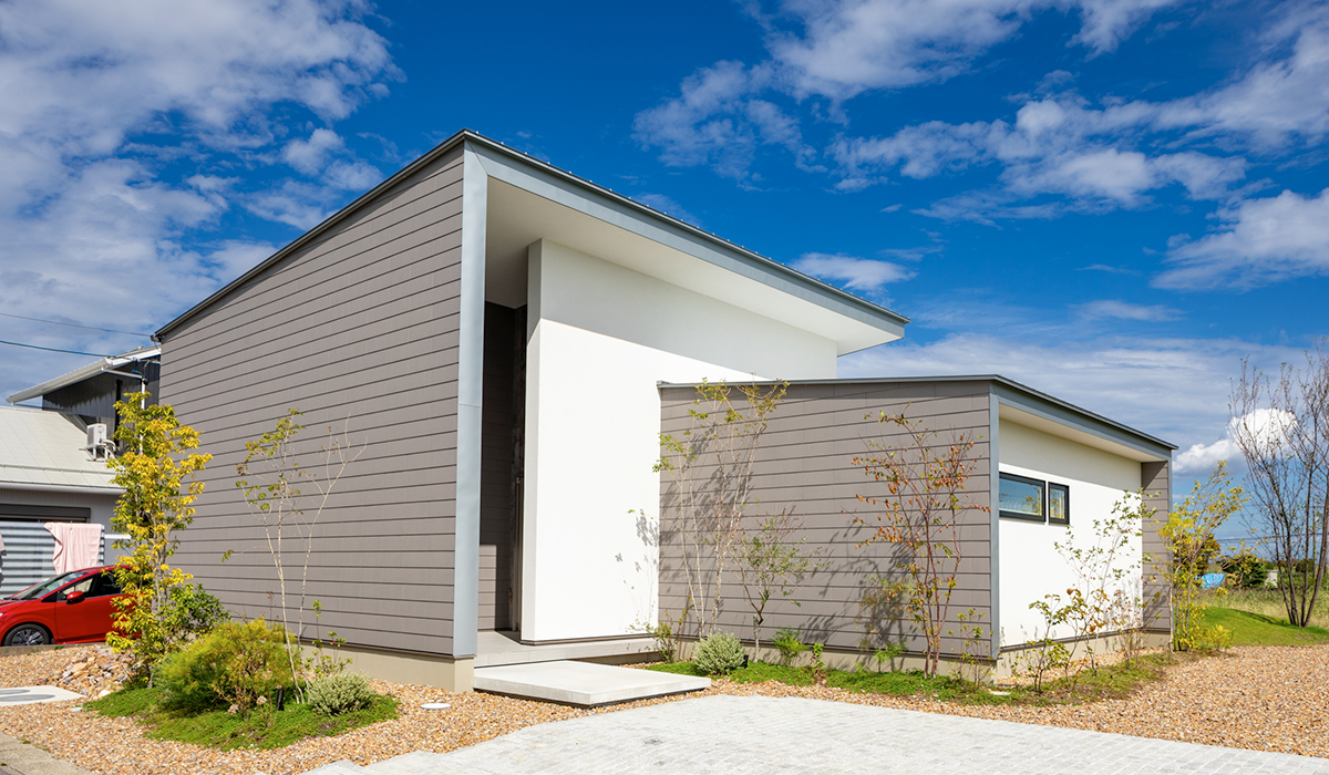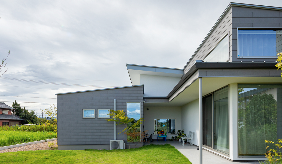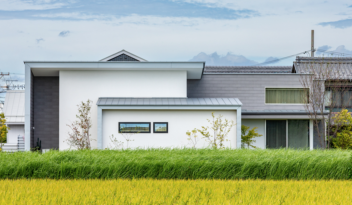 片田舎の緑と空の光を穏やかに受け止めるモダン邸宅。 外壁は反射しやすいホワイトとシルバーを選色したが、マットな素材のみを使用することで、反射を抑え周辺環境との調和を意識した。近代建築、現代建築の要素を設計に取り入れながら、自然と和する上品な平屋を創造した。