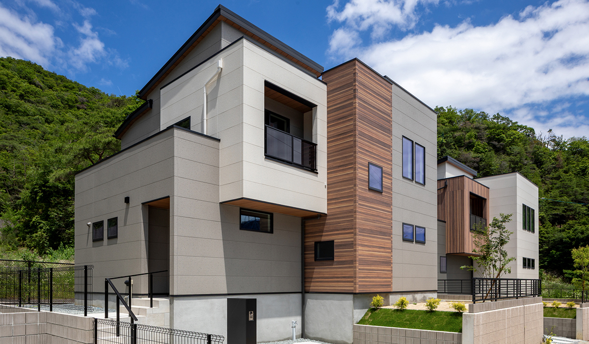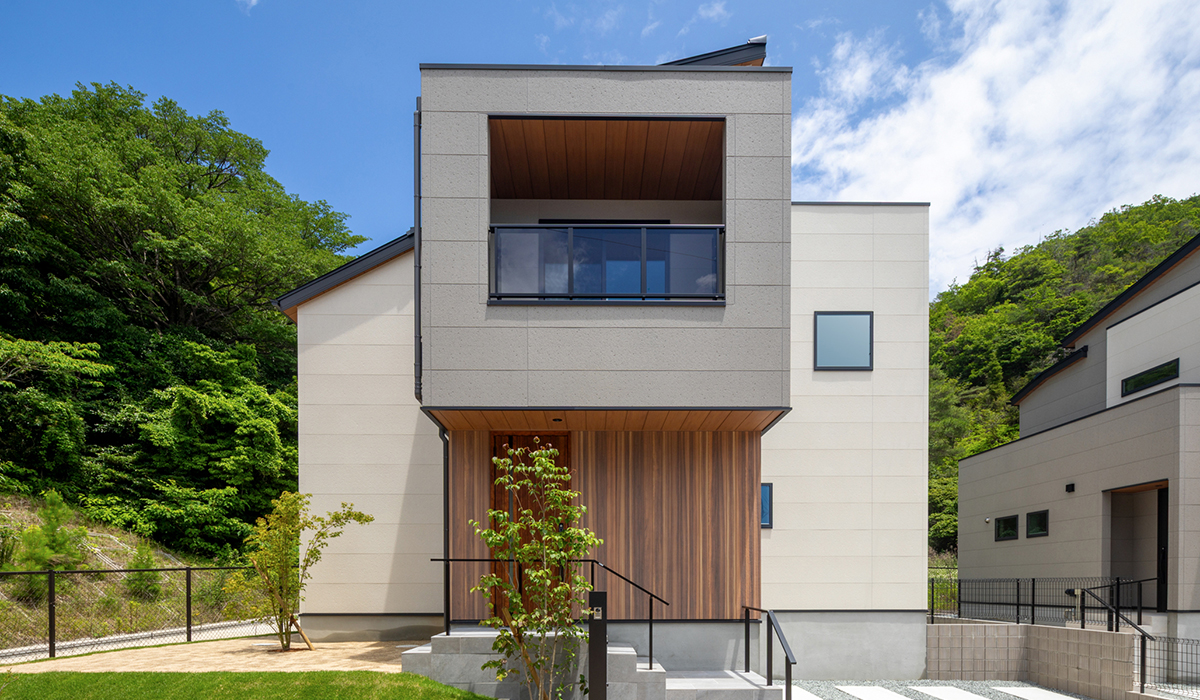 街並みが山々と調和し、静かで穏やかな空間に寄り添うような外観を追求しました。フラットなフレームデザインとモノトーンカラーが現代的な美しさを、木目が自然との繋がりを感じさせます。室内の窓からは四季折々の緑が広がり、自然に包まれたような贅沢な日常を演出します。