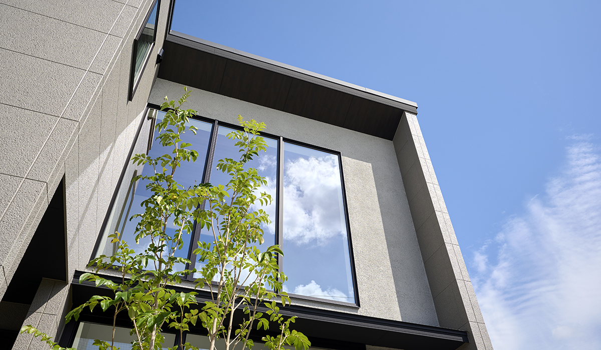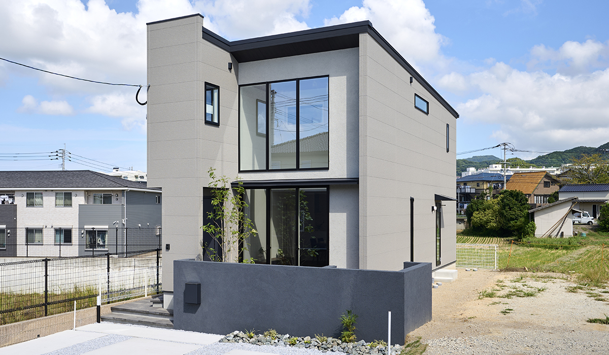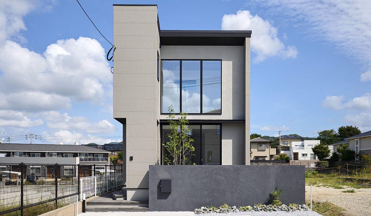 外観は、凹凸を付けてグレーの陰影をデザインし、前面道路側に庭があるもののプライベートが確保されたセミオープンな庭とした。