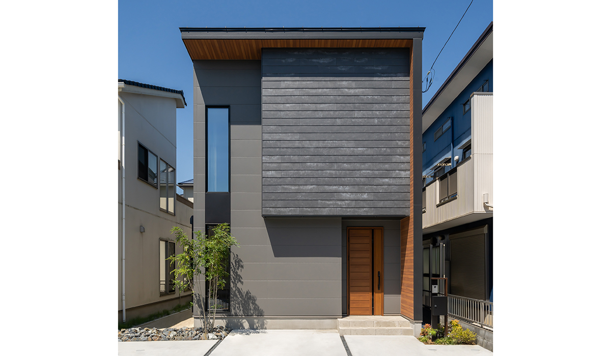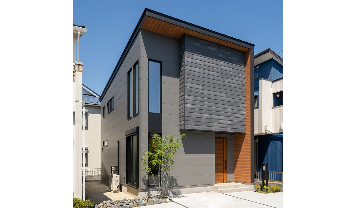 SOLIDOならではの素材感を活かし、同系色のグレーで統一。木目を合わせることで無機質になりすぎず、都会的で温かみのある外観に仕上げました。