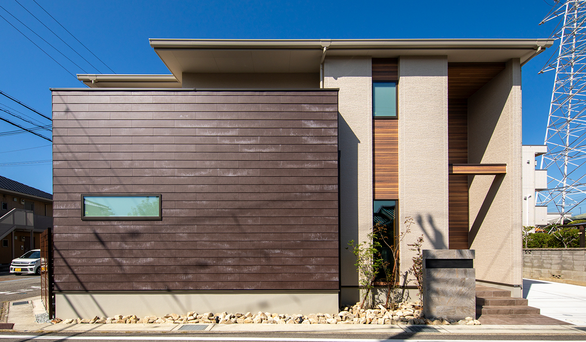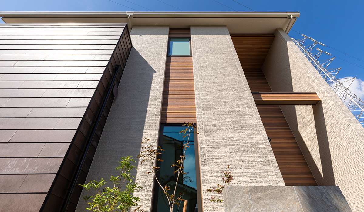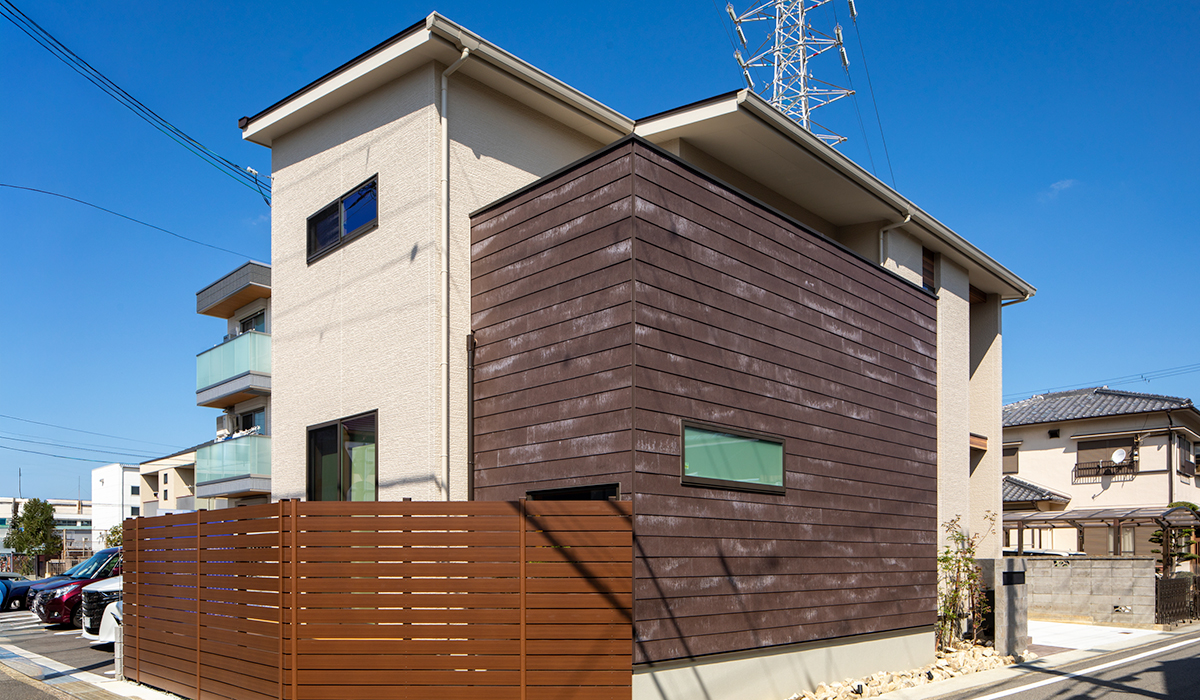 角地に立つモデルハウスの計画で、二方向の道路から見た建物の個性と存在感が引き立つよう壁面の表情が豊かなSOLIDOを採用しました。ファサードはセメントの質感のある水平ラインと木の質感のある垂直ラインを対比させ、それぞれの素材感を生かした外装でまとめました。