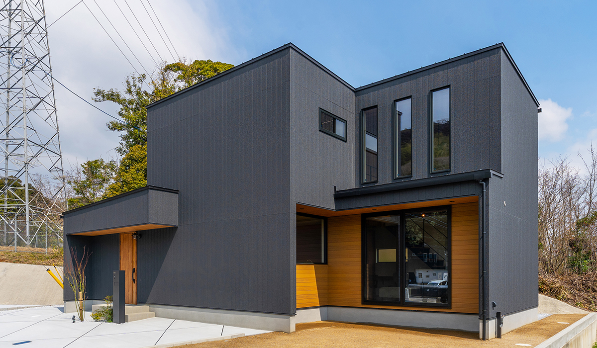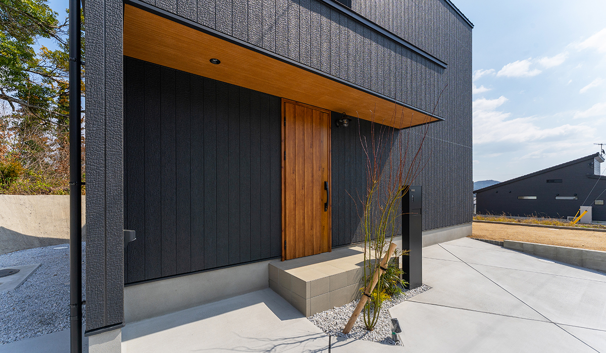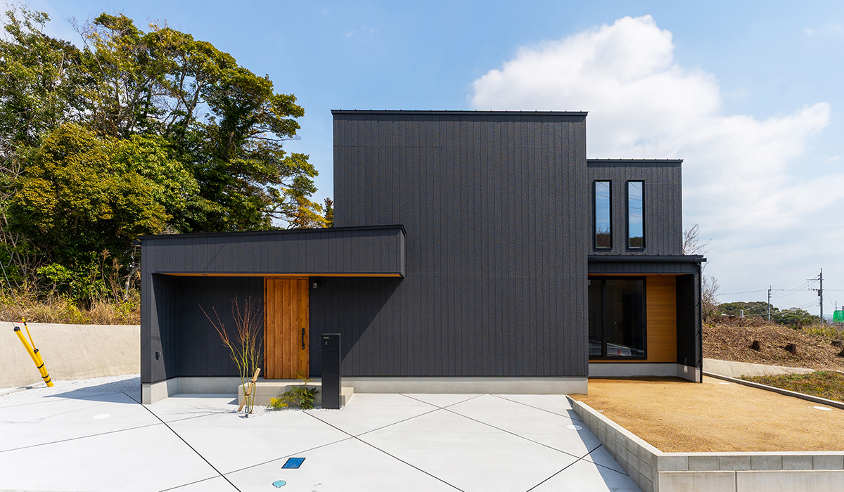 正面からのデザインを3つの箱が折り重なるようなモダンな形状として、外壁を焼杉調のサイディングを使用することにより、昔ながらの日本伝統的な表情と建物自体のモダンな雰囲気を織り交ぜた外観デザインを作成いたしました。