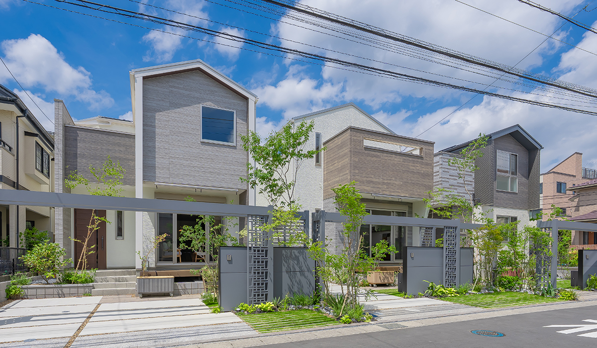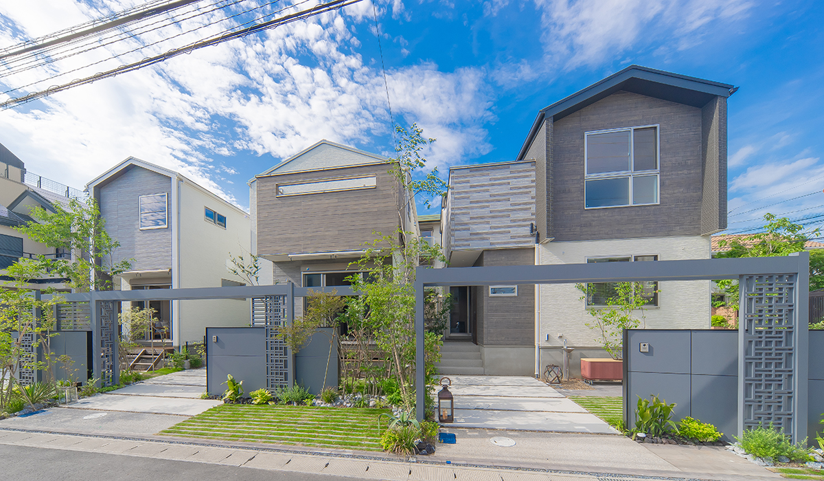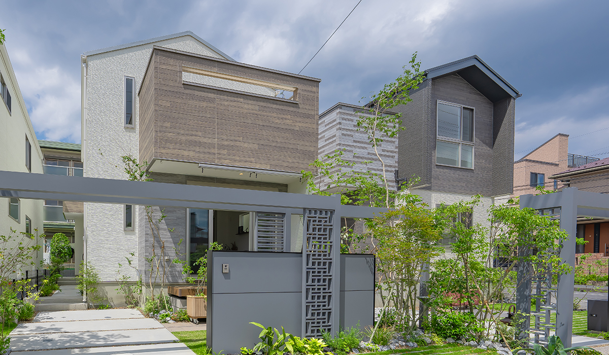 家・庭・カーポートをボーダーレスに繋ぎ、暮らしの自由度を最大化。切り妻屋根のフレームと箱型を組み合わせた外観に、質感豊かなサイディングと植栽が、シンプルながらも表情豊かなデザインを実現しました。