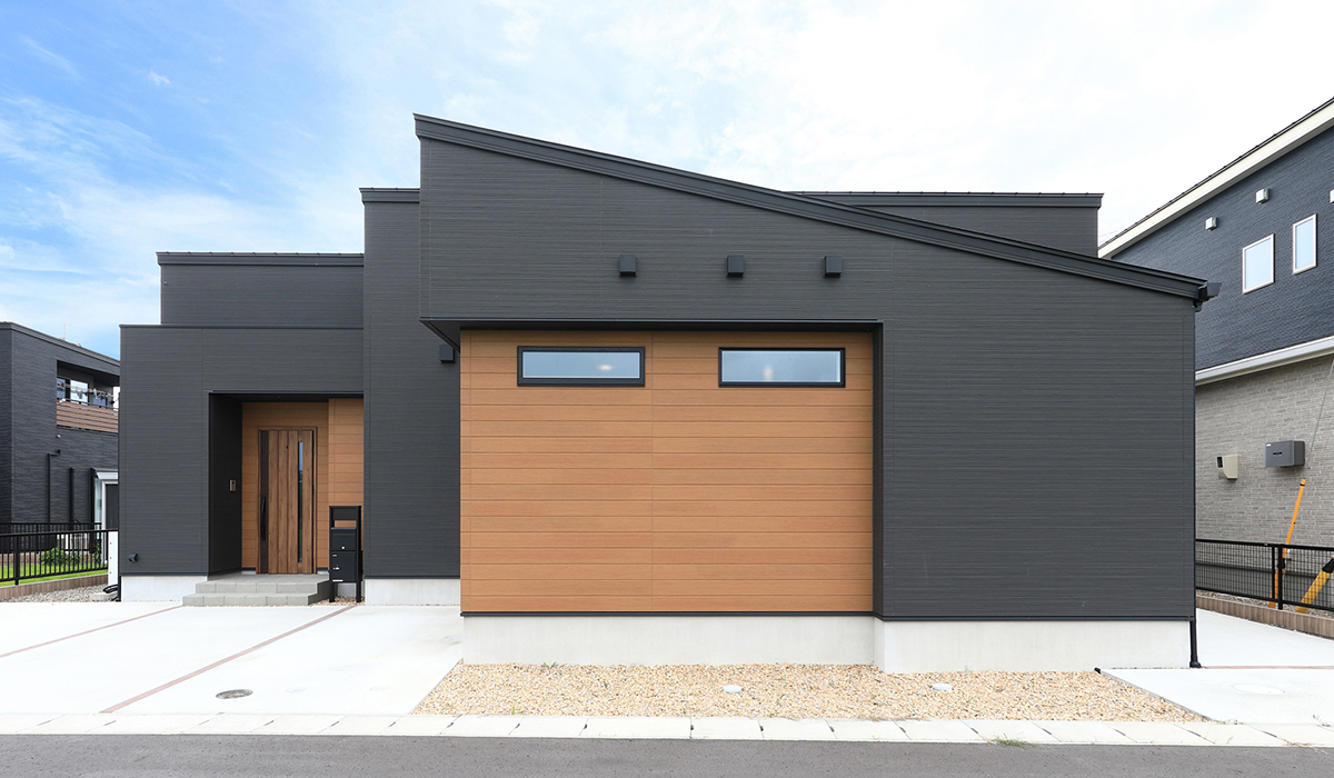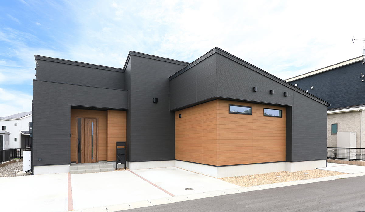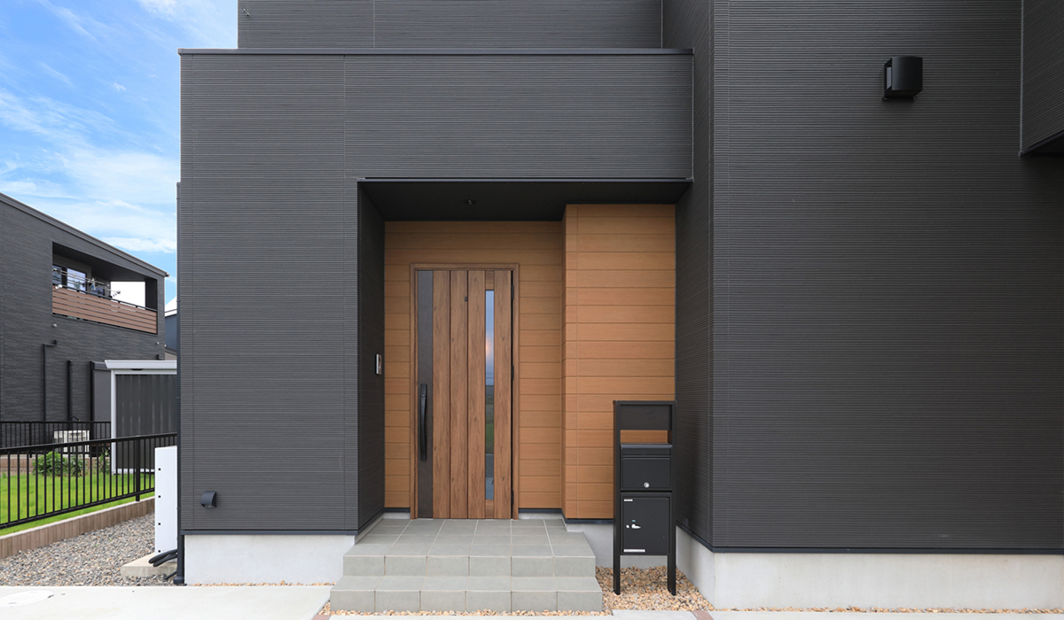 ベースはブラックのモダンスリットでシンプルにまとめながら、玄関ドアと調和のとれたアーバンシダー オレンジ色を採用。深みのある色合いと木目の温もりが調和した配色。平屋特有の低い視線とマットなサイディングも相まって、穏やかな印象を与えています。