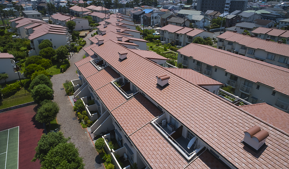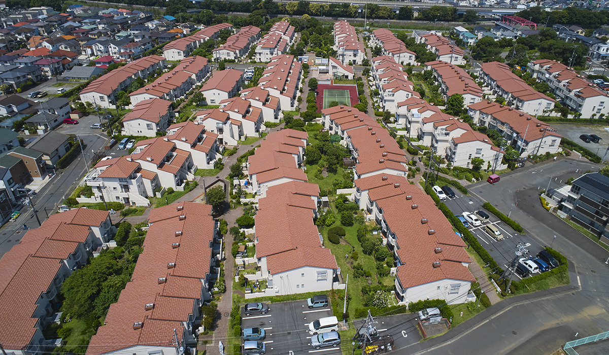 新湘南バイパスを湘南方向に進む高速道路の左手から、38棟4150坪の緑に囲まれた3F建ての切妻屋根の住まいが現れます。南手には湘南の海、西には富士山を眺めながら、白壁とストーンオレンジの屋根が出迎えてくれます。