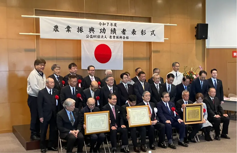 公益財団法人農業振興会館の公益事業として平成2 年度から実施されている「農業振興功績者表彰」において、農業技術の開発や農村環境の整備等に努め、その普及教育に功績のあった個人・団体に贈られる賞です。
