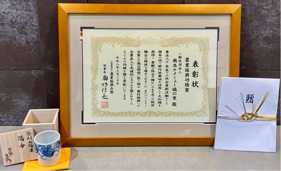 ケイミュー株式会社(本社:大阪市中央区、社長:木村均)が社会貢献活動の一環として支援する一般社団法人 飛鳥ケイミュー橘の里は、このたび公益財団法人農業振興会館が主催する「令和7年度農業振興功績者表彰」において、「農業振興功績賞」を受賞しました。明日香村の推薦を受け、大和橘を通じた地域活性化や、耕作放棄地の活用、就労機会の創出、商品開発を通じた地域振興の取り組みが評価されたものです。