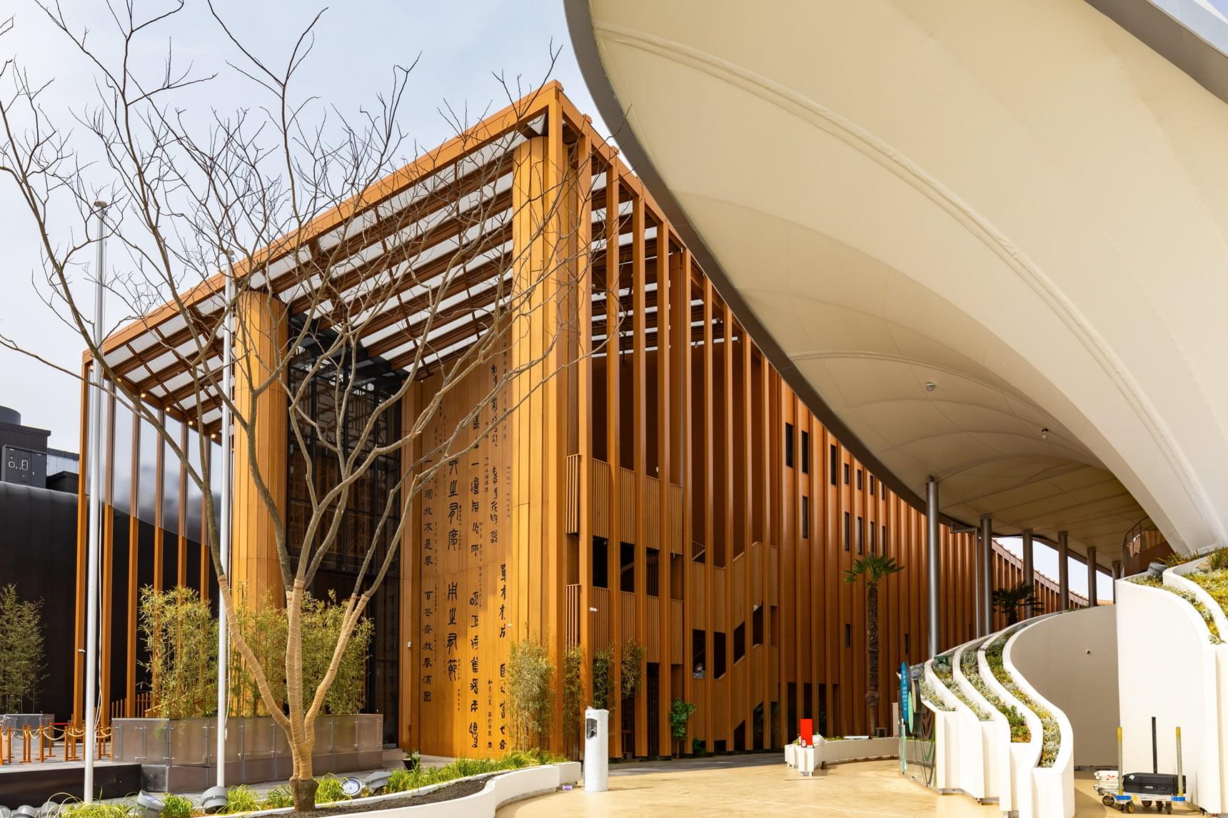 中国館は海外パビリオンの中でも最大級であり、ひときわ目を引く存在です。建物は紙が発明される以前の古代中国で使われていた書物「竹簡」をモチーフとし、巨大な竹の板を広げたようなデザインとなっています。外壁には、中国の歴史を象徴するように、金文、篆書、隷書、行書、楷書の5つの異なる書体で119の漢詩や名文が刻まれています。これは建築物自体が、中国の歴史や文化を表現するアート作品であり、来場者はその壮大な巻物の間を歩くことで、悠久の歴史の中に入り込んだかのような体験をすることができます。