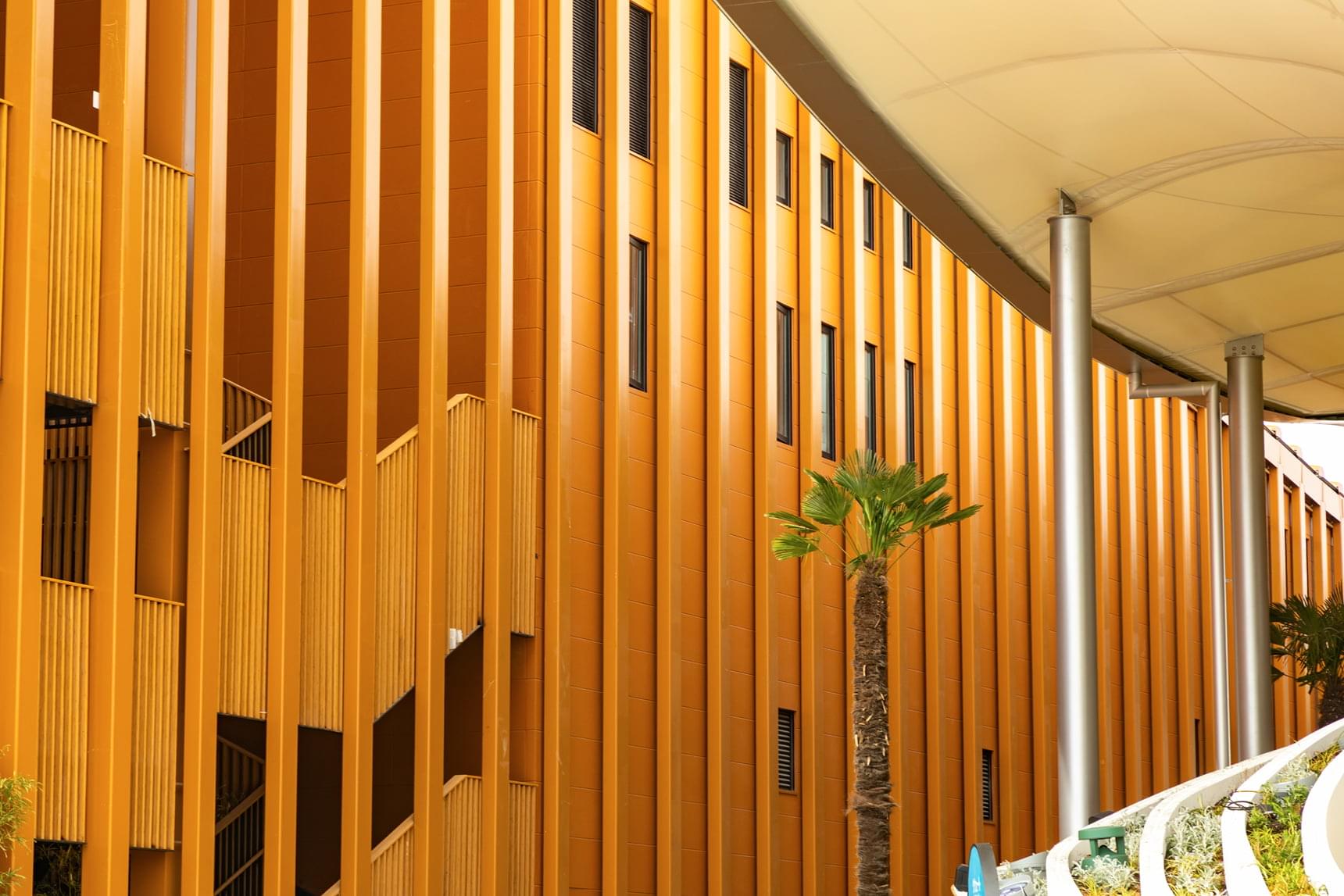 7. 中国館の柱の間の外壁に採用されているのが「新フラット16/デイジー チタン オレンジ」。フラットなデザインが無理なく建物と調和する