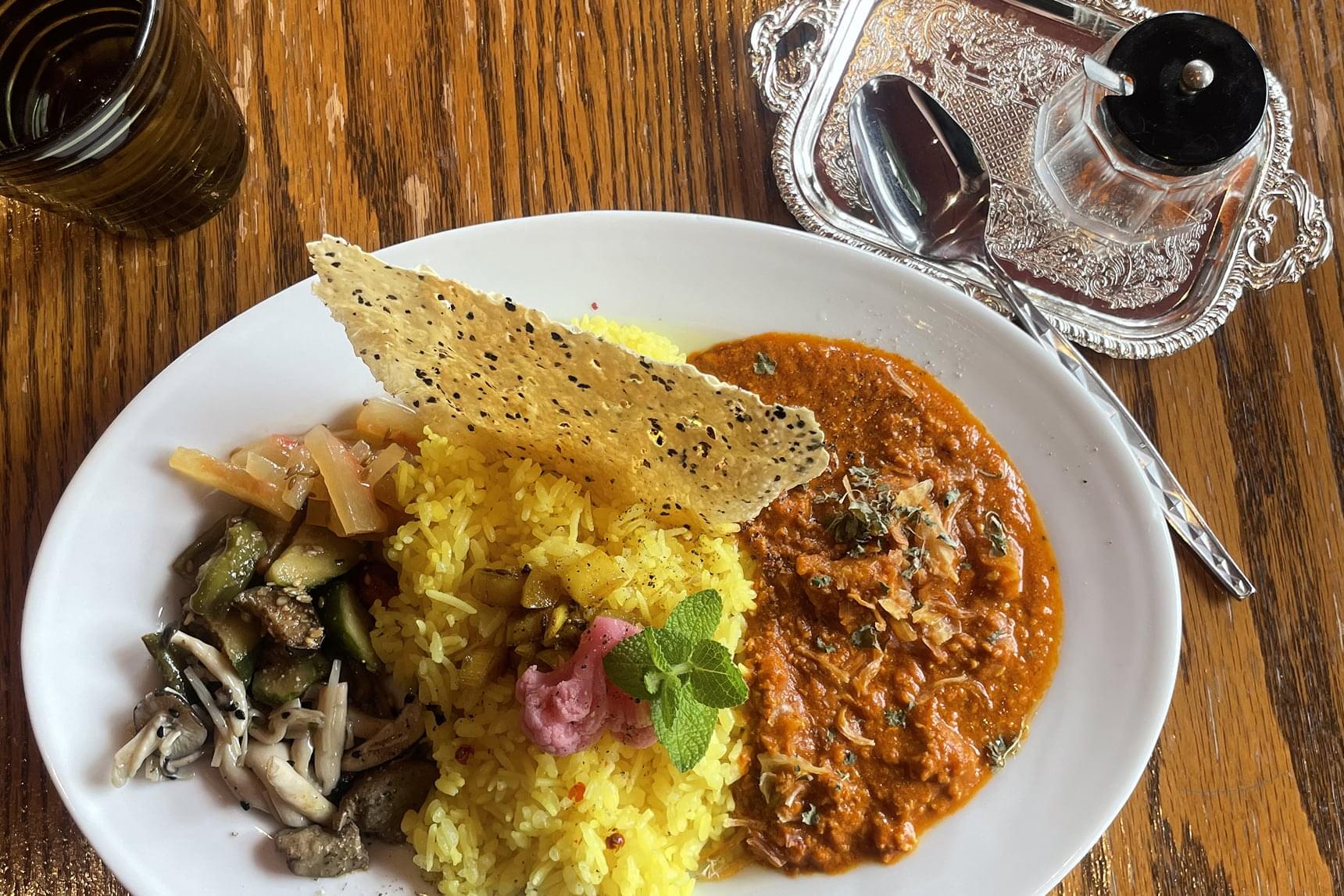 店舗やイベントではスパイスをオリジナルで調合したカレーを提供しています。スパイスを使った副菜も美味。【写真:石井妙子】