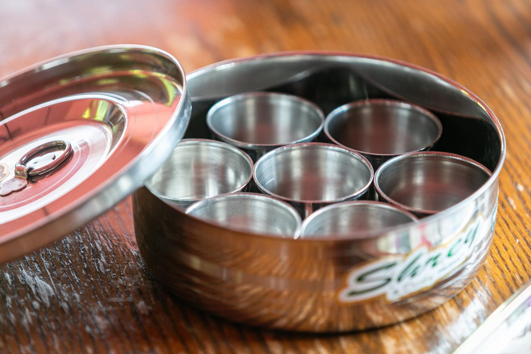 インドで売られているスパイスボックス。ステンレスの容器によく使うスパイスを入れて台所に常備しておくそう