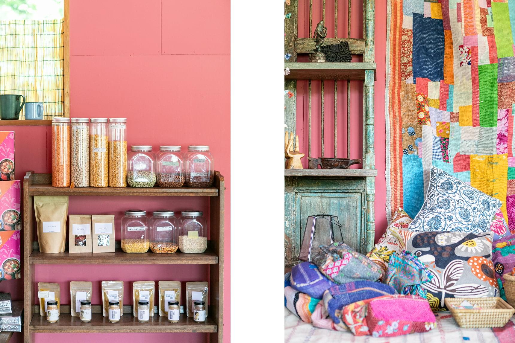 右/食器や雑貨、インドの伝統的な刺子「カンタ」など布小物も販売