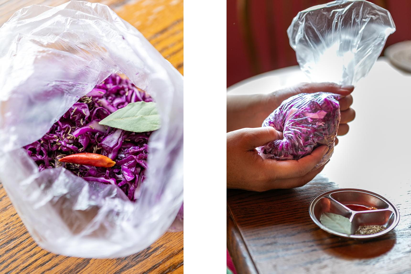 3.袋の上から揉み込むと、キャベツから水分が出てくる【写真右】。