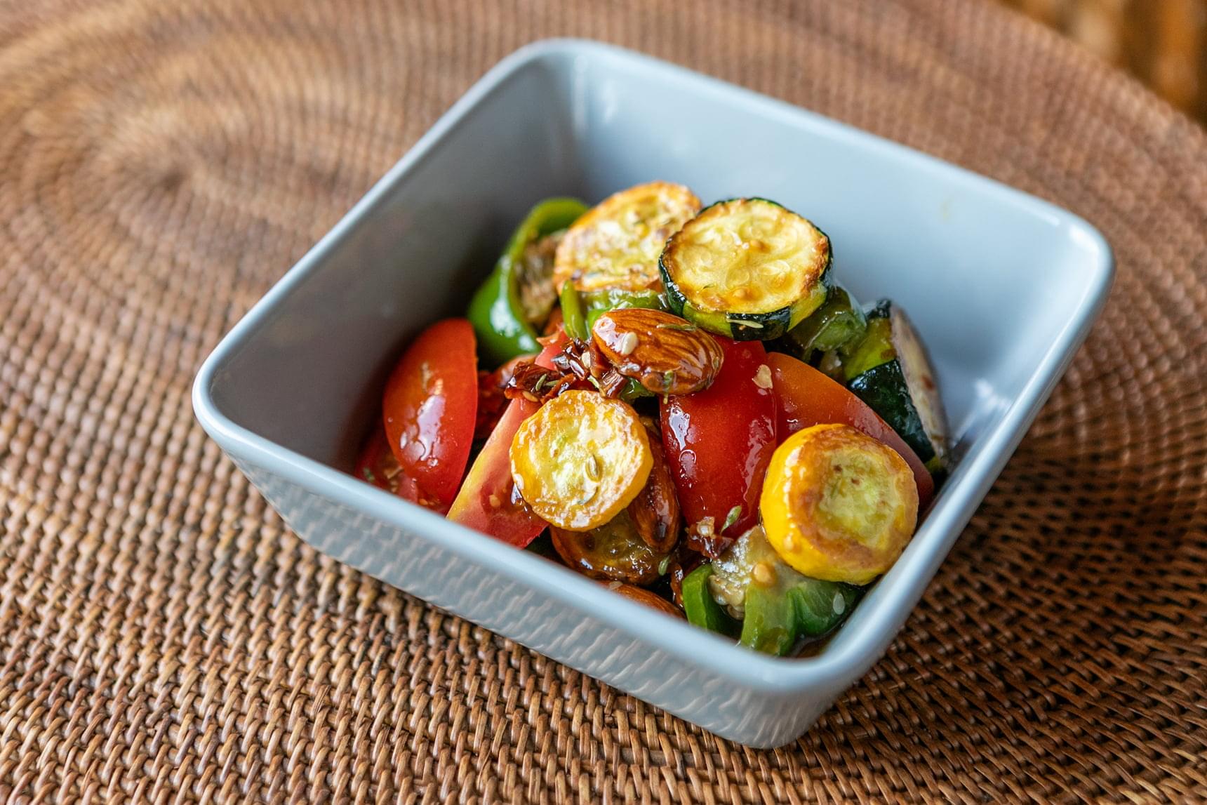マリネ液にスパイスとハーブを足して香り豊かに。簡単に作れるので、多めに作って常備菜にしておくと季節の野菜をたっぷり食べられるうえ食卓が華やぎます。香ばしいアーモンドの風味と食感もポイント。