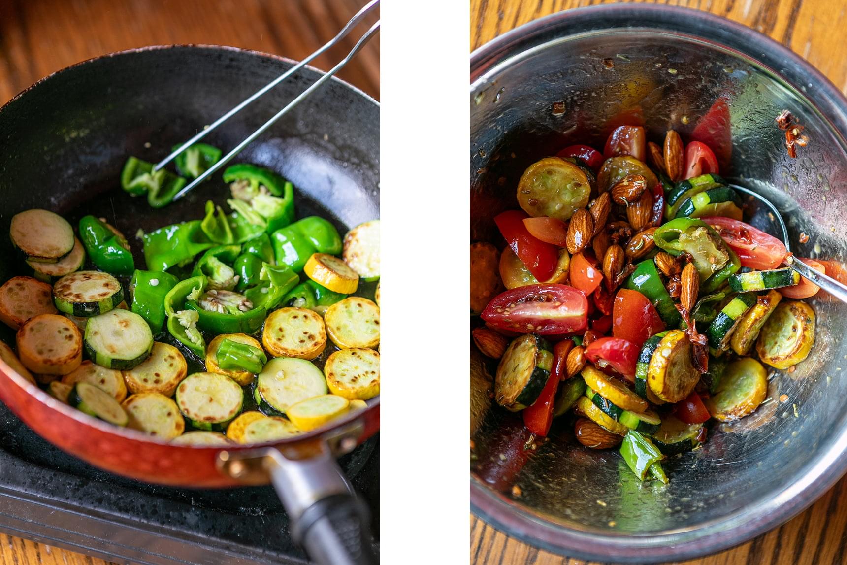 右/マリネ液で炒めた野菜とアーモンドを和える