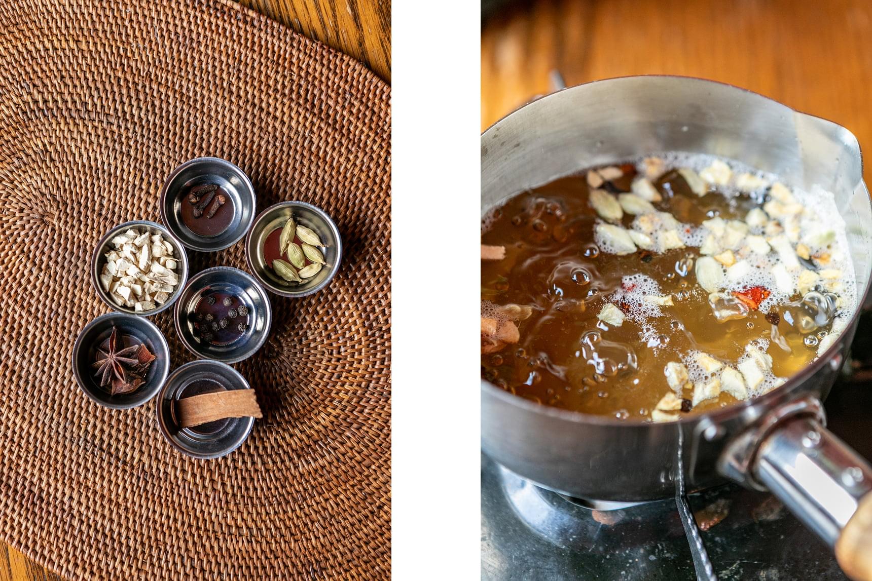 左/材料のスパイス。上から時計回りにクローブ、カルダモン、ブラックペッパー、シナモン、スターアニス、乾燥ジンジャー
