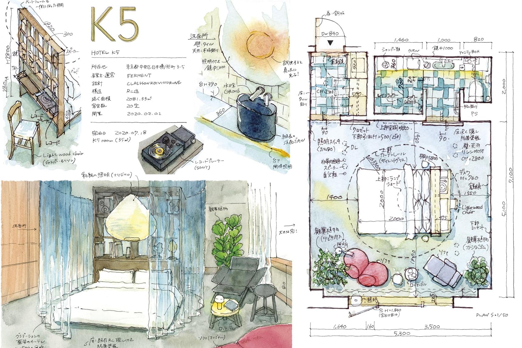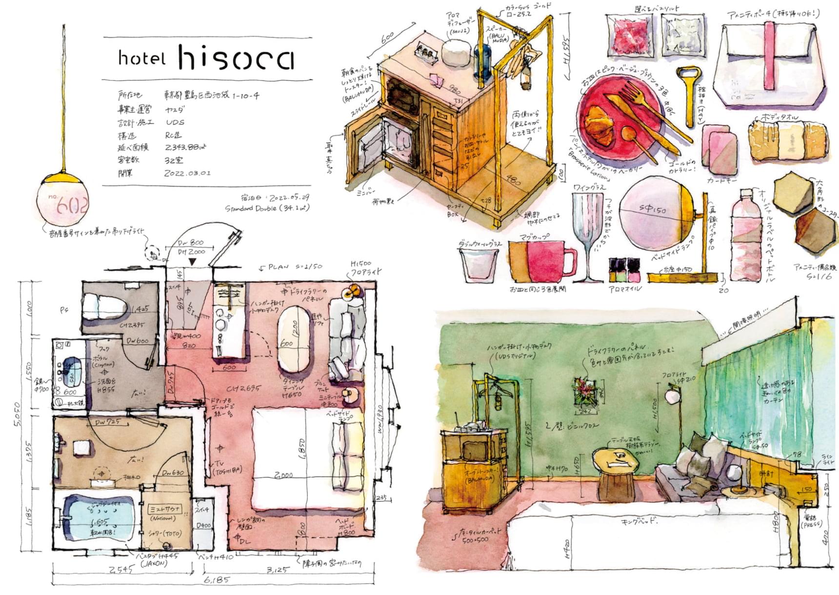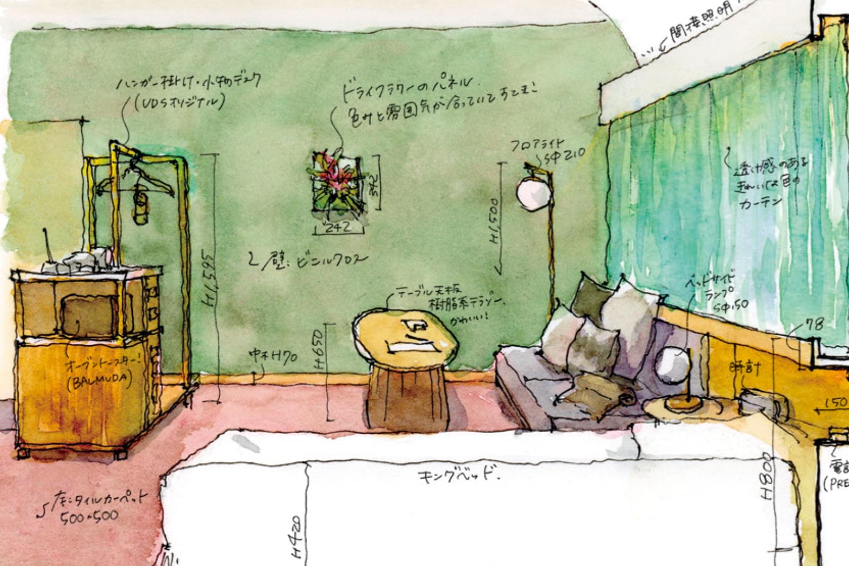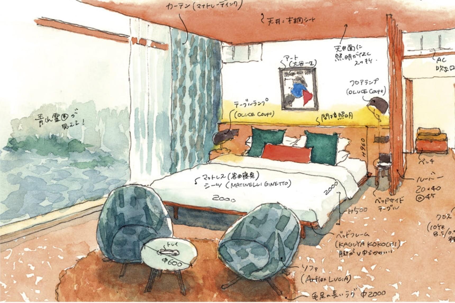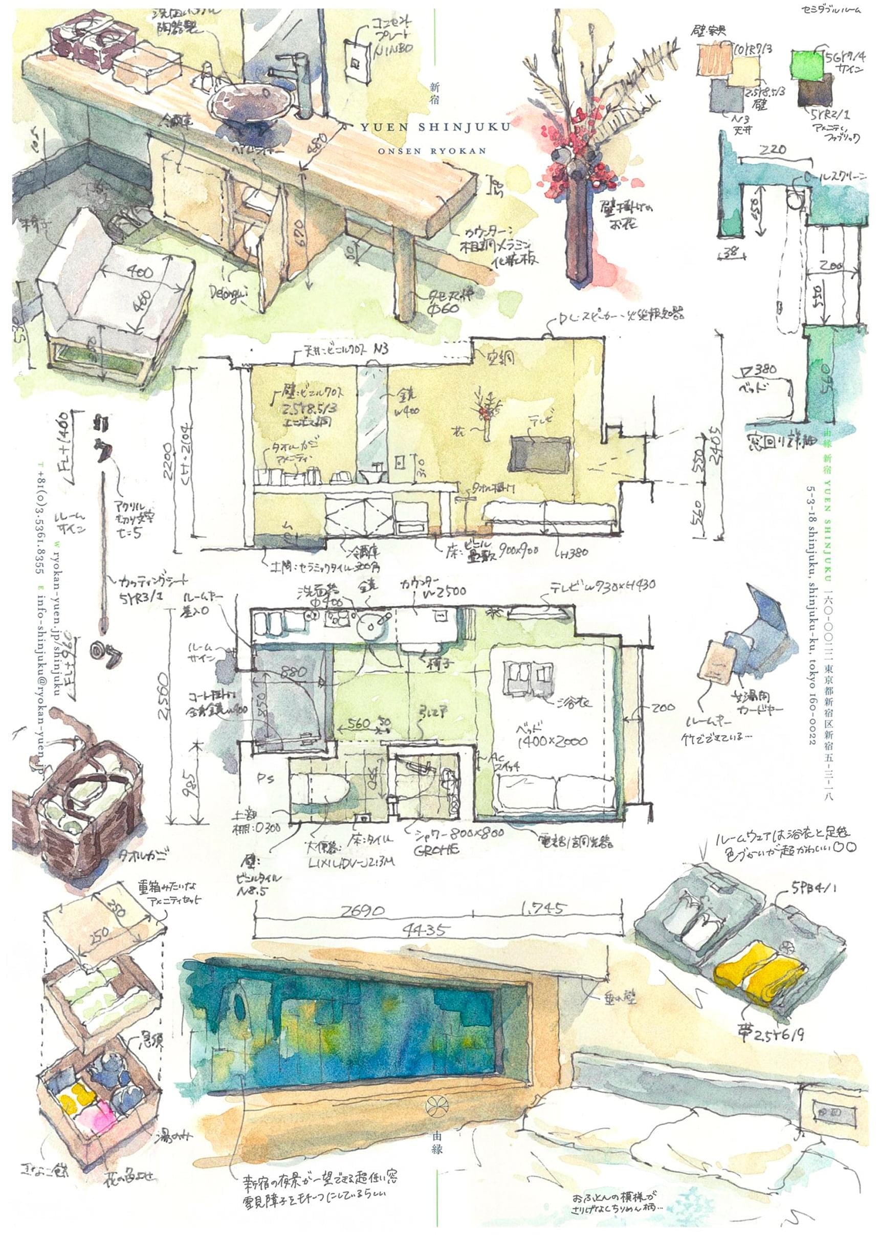 遠藤さんが描いた東京・新宿のホテル「ONSEN RYOKAN 由縁 新宿」の実測水彩スケッチ。客室の平面図は、実際の大きさの1/50スケールで描く。空間や家具、設備だけでなく、各種アメニティも描かれているため、眺めているだけで実際に泊まったような臨場感を感じる