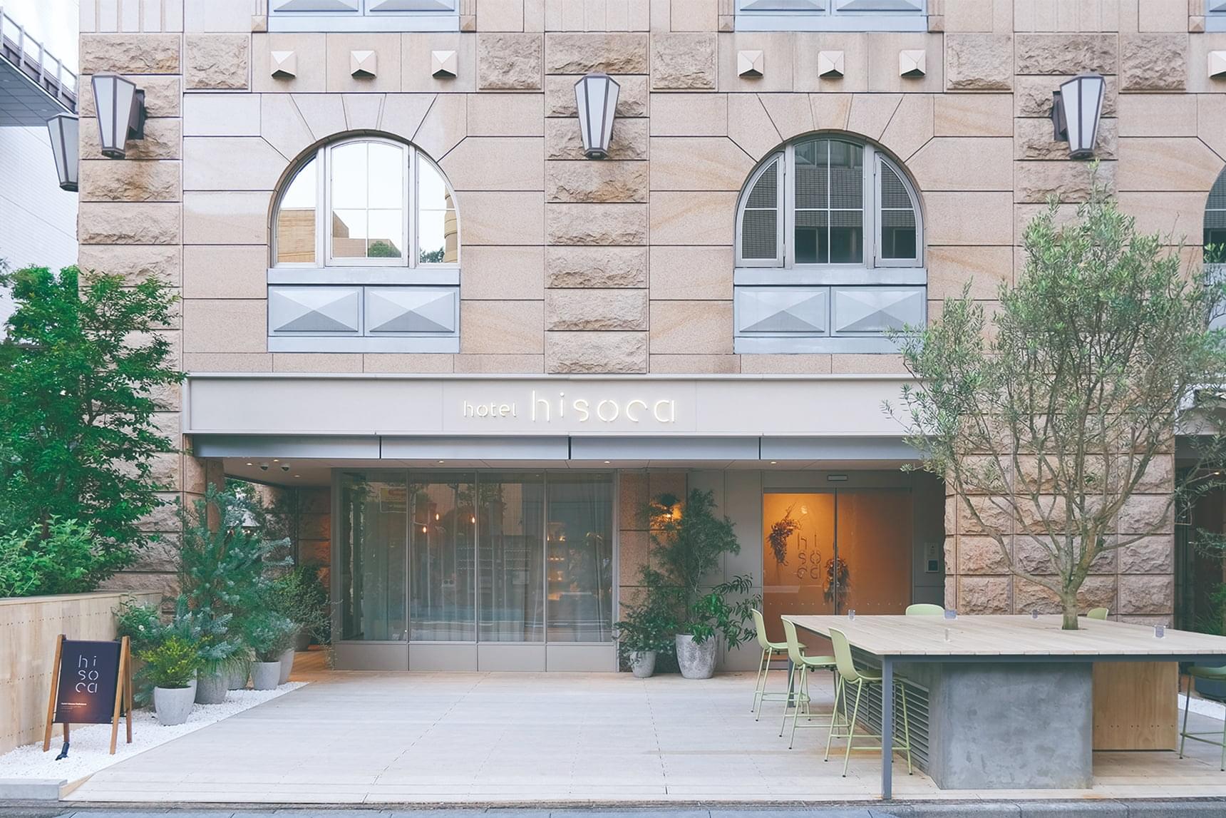 池袋駅から徒歩2分という都会の只中にありながら、ミニマムな看板や植栽ですっきりとした佇まいをつくっている「hotel hisoca ikebukuro」。築19年のホテルをリノベーションして生まれた施設で、ファミリーやグループでも楽しめる現代的な空間へと生まれ変わりました。ダスティピンクとダスティグリーンをテーマカラーにした統一感のある世界観は、若い世代を中心に人気を集めています。