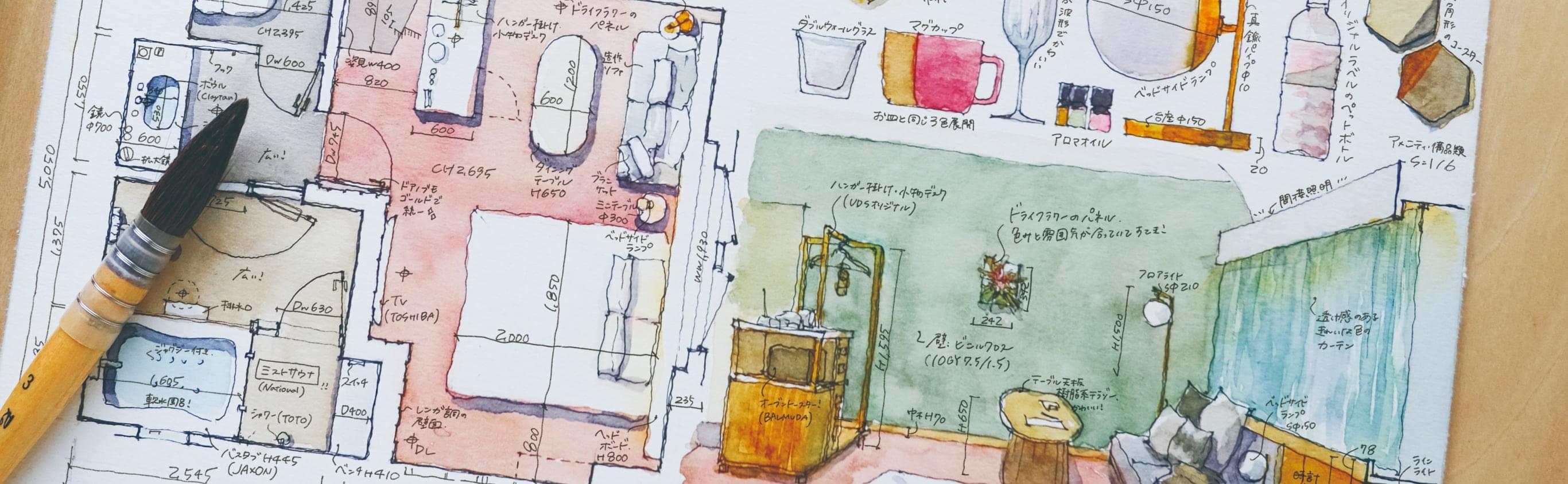 遠藤さんが描くホテルの実測スケッチが教えてくれたのは、自分にとっての空間の心地よさを探る大切さ。記憶の中の鮮やかなイメージを、現実の数値や色で「測る」視点と、理想の空気感を「描く」想像力。この2つを持つことで、私たちの住まいはもっと自由で豊かなものになるはずです。旅先のホテルで出会った非日常から、日常を彩るヒントを見つけてみてはいかがでしょうか。